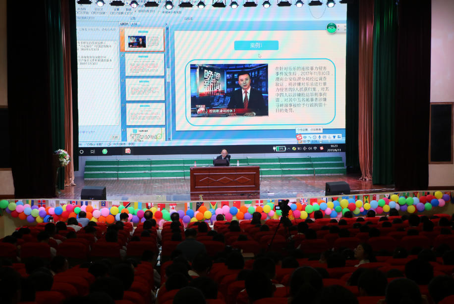 为进一步加强青少年法制观念,丰富青少年法律知识,提高青少年辨别是非和自我防范的能力,促进青少年自觉抵制校园欺凌不良行为,真正做到知法、懂法、守法、护法,2019年6月11日下午,江苏三法律师事务所江北分所主任张超、执行主任章宁走进南京外国语学校仙林分校,为初一年级学生带来了一场精彩生动的法制教育讲座。南京外国语学校仙林分校校长董正璟、执行校长张玉东、副校长孙小燕、校长助理钱俊元、中学部教导处主任郝筱雯、中学部校长助理杨社伟、校团委书记刁淑颖、教学副主任徐广宇等出席活动,现场由张国其主任主持。