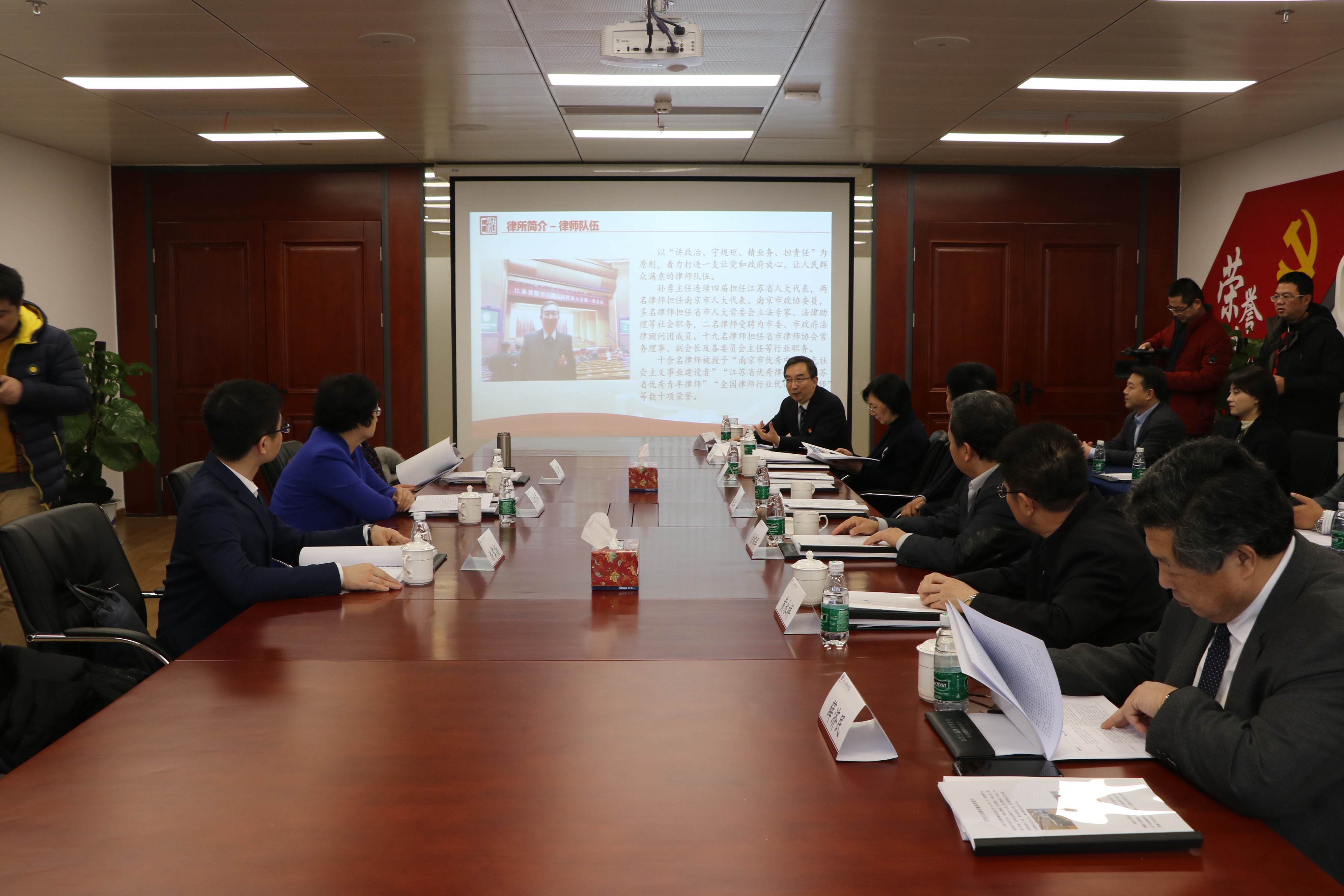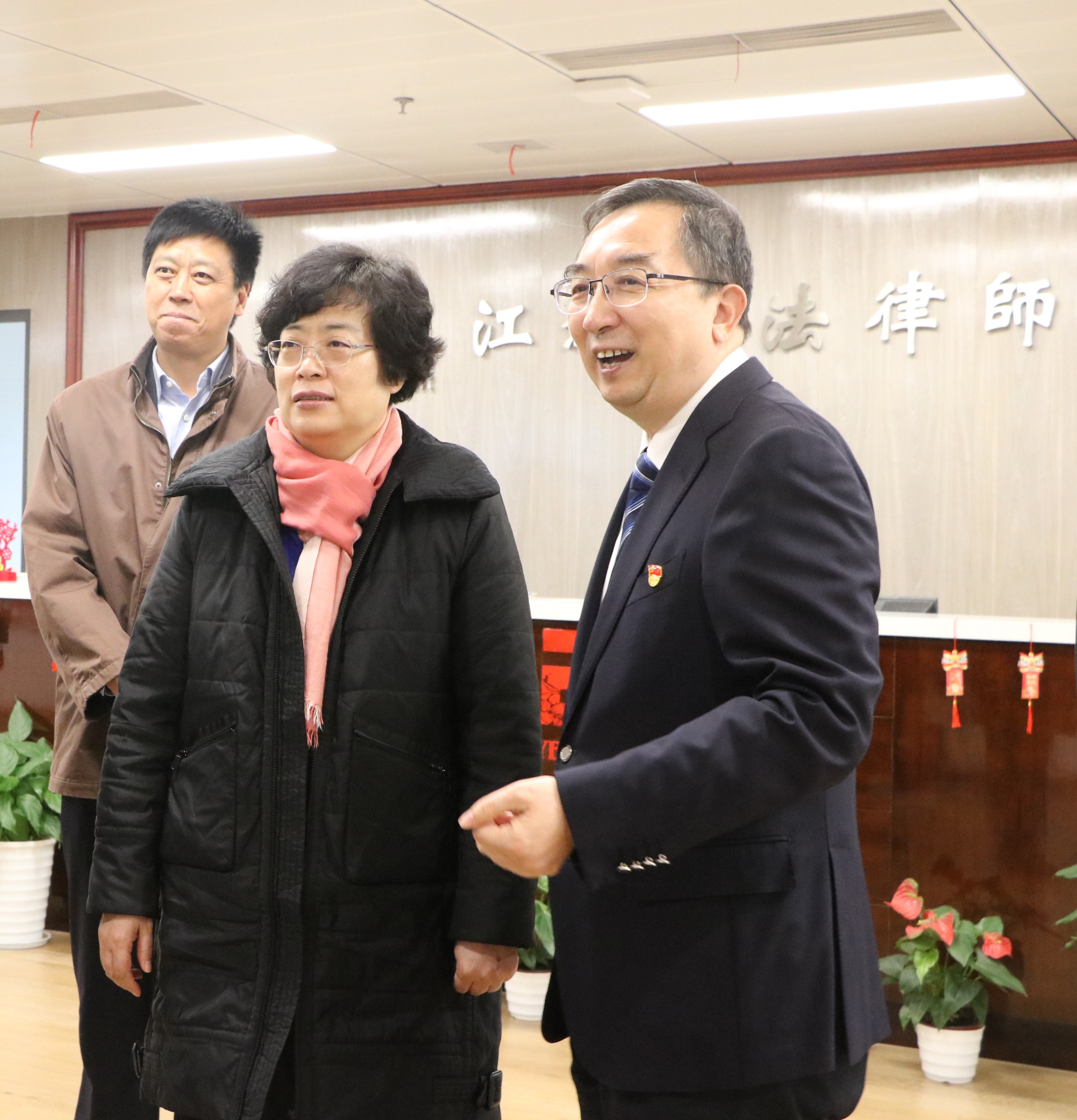 2020年1月8日下午,司法部党组成员、政治部主任冯力军,司法部政治部人事警务局副局长张青,司法部办公厅秘书洪章扬莅临江苏三法律师事务所调研慰问。省司法厅厅长、党委副书记柳玉祥,省司法厅党委委员、政治部主任赵庭朴,政治部副主任李萍,省司法厅律工处处长曹扬文,市委常委、政法委书记徐锦辉,市司法局党组书记、局长黄永祥,市司法局律工处处长凌盛广,省律师协会会长薛济民陪同慰问,江苏三法律师事务所主任孙勇热情接待。