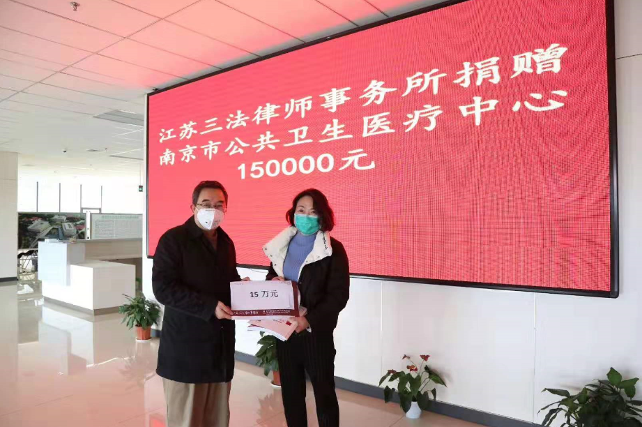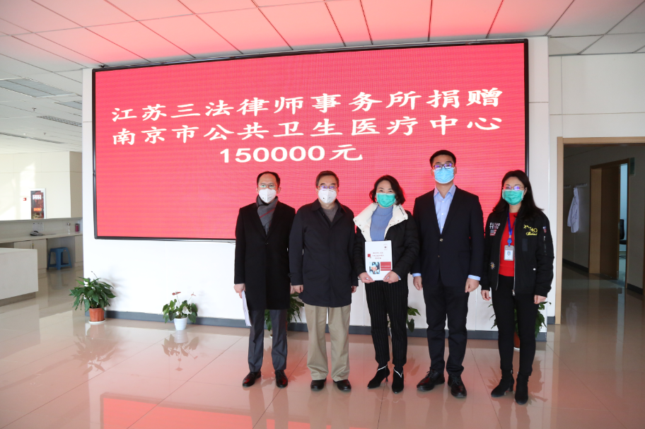 2020年2月5日早上8点多钟,江苏三法律师事务所主任孙勇、副主任张超、管理合伙人王和平等律师来到了位于汤山的南京市公共卫生医疗中心,这里集中收治了南京市所有确诊的新型冠状病毒肺炎病例,这里的医护人员承担了巨大的风险与压力,三法所主任孙勇将15万元的爱心款及200册《南京市第二医院专项公益法律服务资料汇编》交至南京市第二医院邵蔚副院长手中,向战斗在一线医务人员进行慰问,提供物质和精神上的支持。