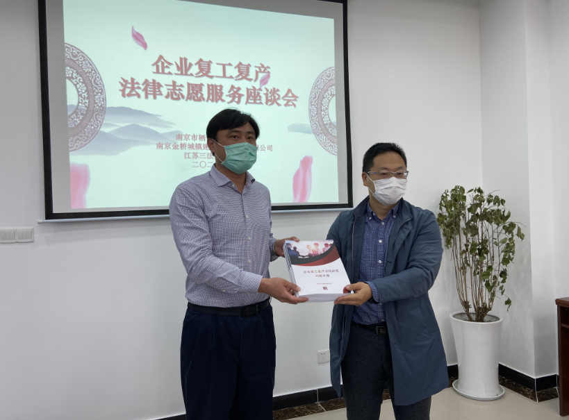 座谈会后,江苏三法律师事务所向南京金桥城镇建设综合开发有限公司总经理周晓俊转交了《企业复工复产法规政策问答手册》,全方位、多元化的为企业复工复产提供精准法律服务。
