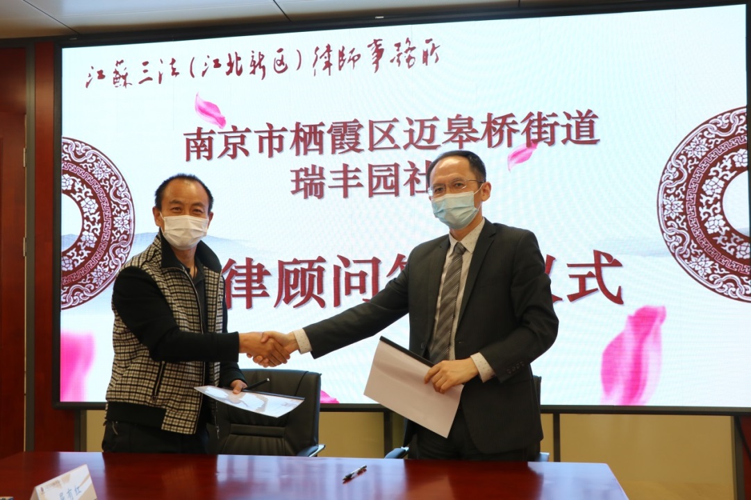会议最后,江苏三法律师事务所副主任张超与南京市栖霞区迈皋桥街道社区的书记签署了社区法律顾问协议。