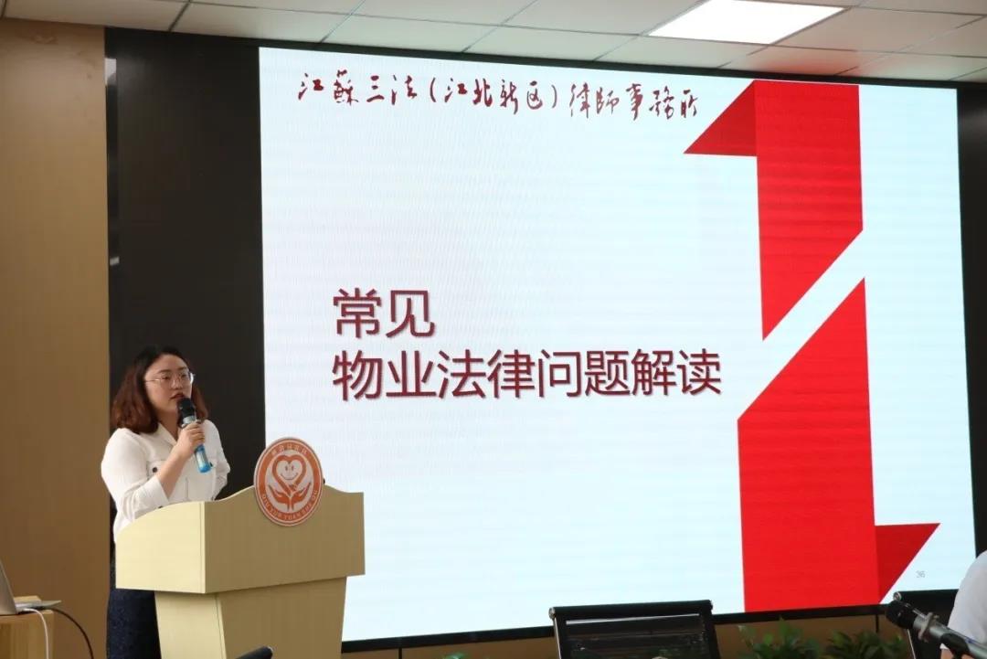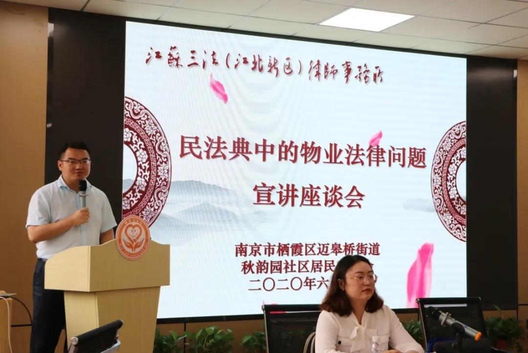 6月5日下午,为更好帮助社区了解刚在十三届人大三次会议通过、即将于2021年1月1日施行的《中华人民共和国民法典》(后简称《民法典》)中与物业管理、侵权责任相关的新规定、新法条,江苏三法律师事务所和江北新区分所来到栖霞区迈皋桥街道秋韵园社区举行了“民法典中的物业法律问题”宣讲座谈会。此次宣讲座谈会的主讲人员有江苏三法律师事务所的李全律师、李珊珊律师以及江苏三法(江北新区)律师事务所的陈曲律师。栖霞区迈皋桥街道的景和园社区、山水园社区、春晓园社区、瑞丰园社区和秋韵园社区的物管企业负责人员参与了此次座谈宣讲,秋韵园社区居民委员会进行了组织接待工作。
