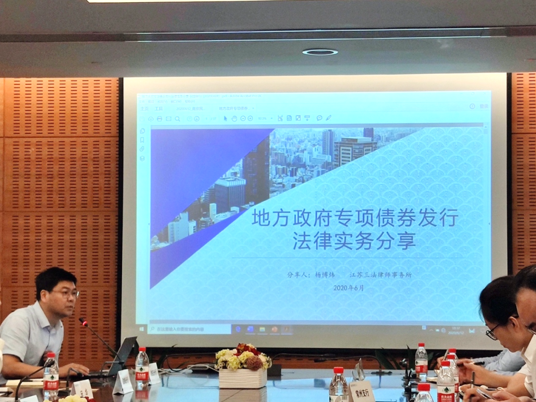 2020年6月12日,江苏三法律师事务所一级合伙人杨博炜、专职律师颜宏宇一行受邀参加民生银行地方政府专项债交流研讨会。此前,三法所杨博炜律师与李保军律师曾于2019年12月26日为民生银行南京分行部分新入职员工进行过小规模的培训分享,今再次受邀为民生银行南京分行及泰州、连云港、徐州、常州、淮安、盐城等省内分行代表做地方政府专项债券发行法律实务分享。