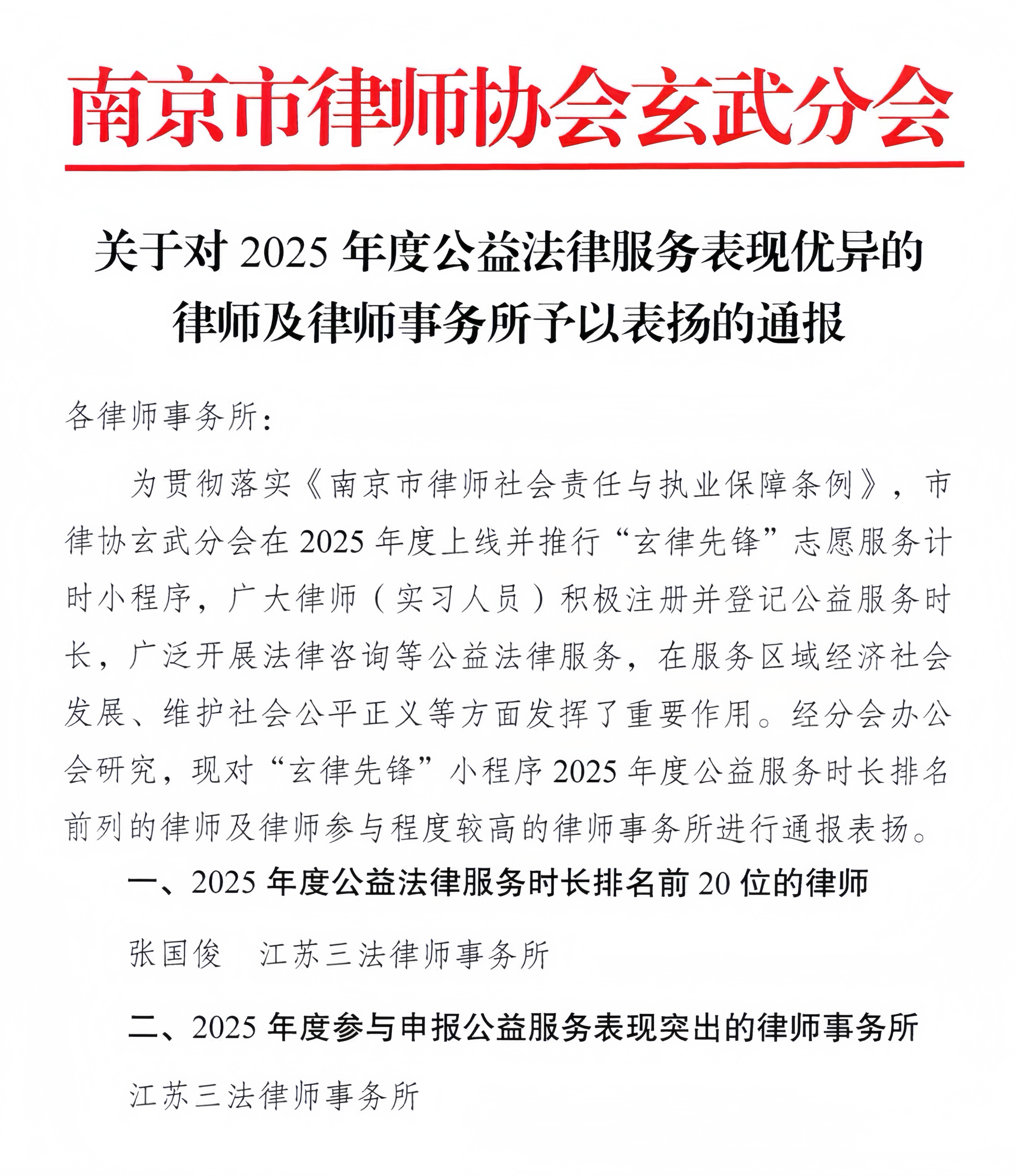 3月31日,南京市律师协会玄武分会发布了《关于对2025年度公益法律服务表现优异的律师及律师事务所予以表扬的通报》,江苏三法律师事务所获评“2025年度参与申报公益服务表现突出的律师事务所”,江苏三法律师事务所专职律师张国俊荣登“2025年度公益法律服务时长排名前20位的律师”榜单第三位。
