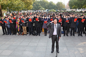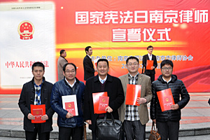 “我宣誓:忠实履行中国特色社会主义法律工作者的神圣使命,忠于祖国,忠于人民,拥护中国共产党的领导,拥护社会主义制度,维护宪法和法律尊严……”初冬十点的鼓楼广场被太阳照的暖暖的,戎浩军律师带领金磊、朱昊、蒋金宝、顾庶民四位新执业的年轻律师,在鼓楼广场参加市司法局、市律师协会组织的“国家宪法日南京律师宣誓仪式”活动。庄严的宣誓仪式,使得在场律师产生强烈的责任感和使命感,对宪法、法律的信仰与敬畏之心更进一层。