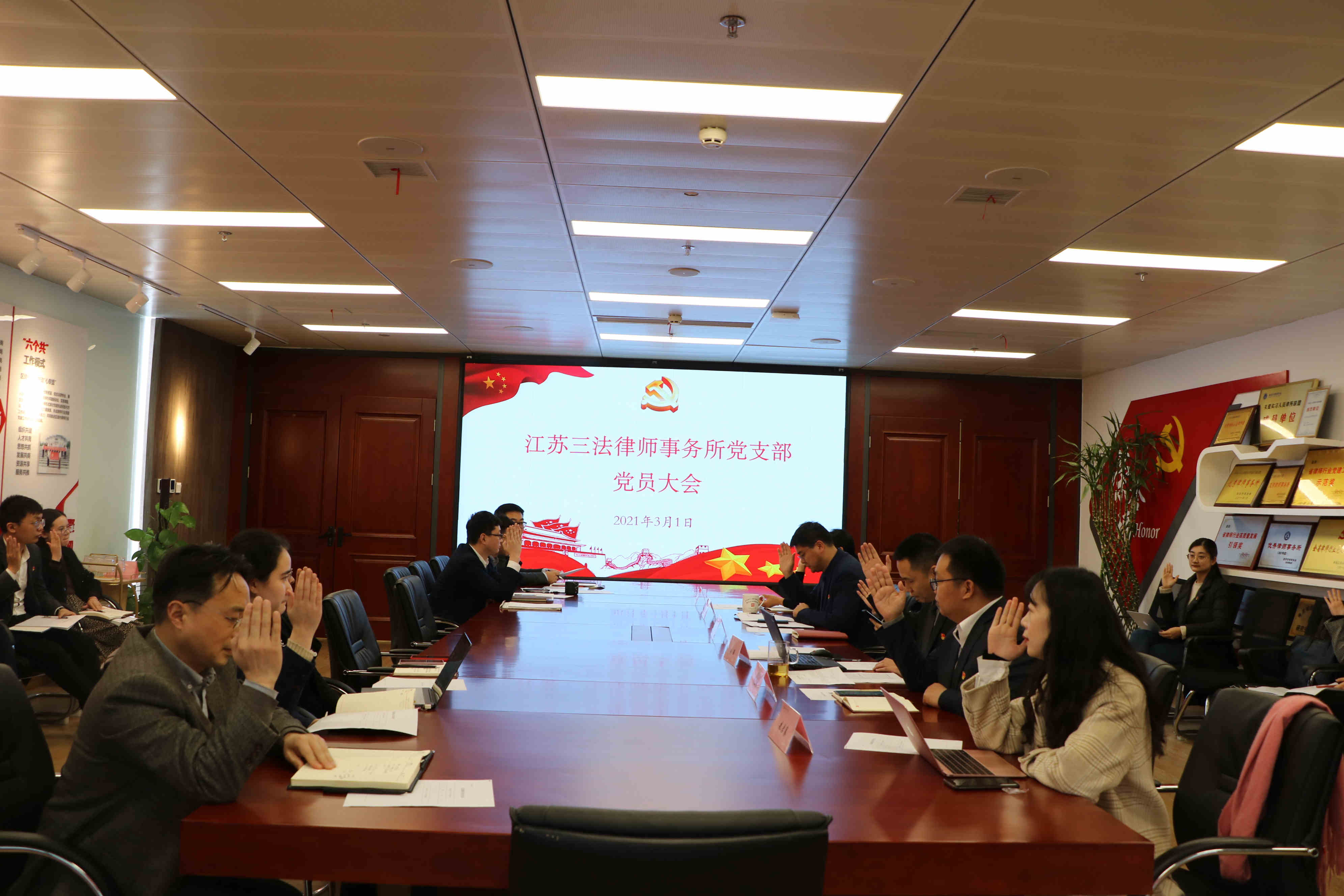 2021年3月1日下午,江苏三法律师事务所党支部召开党员大会,研究2名预备党员转正、1名发展对象转预备党员,江苏三法律师事务所主任孙勇出席大会,全体在所党员律师参加会议。党支部书记刘伟主持会议。