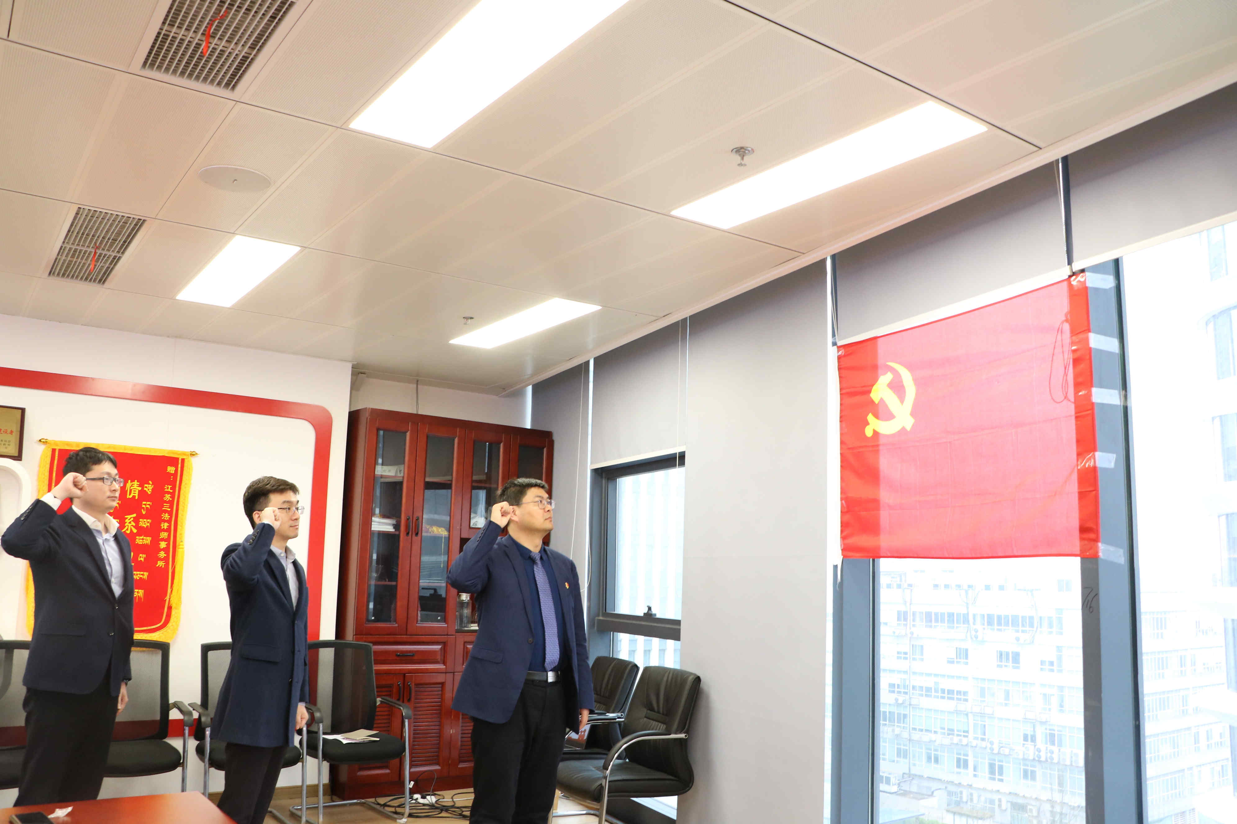 最后,在江苏三法律师事务所党支部副书记、高级合伙人杨博炜的带领下,乔志培、贾清屹2名同志面向党旗,佩戴党徽,庄严的举起右手,宣读入党誓词,光荣的成为了中国共产党党员。