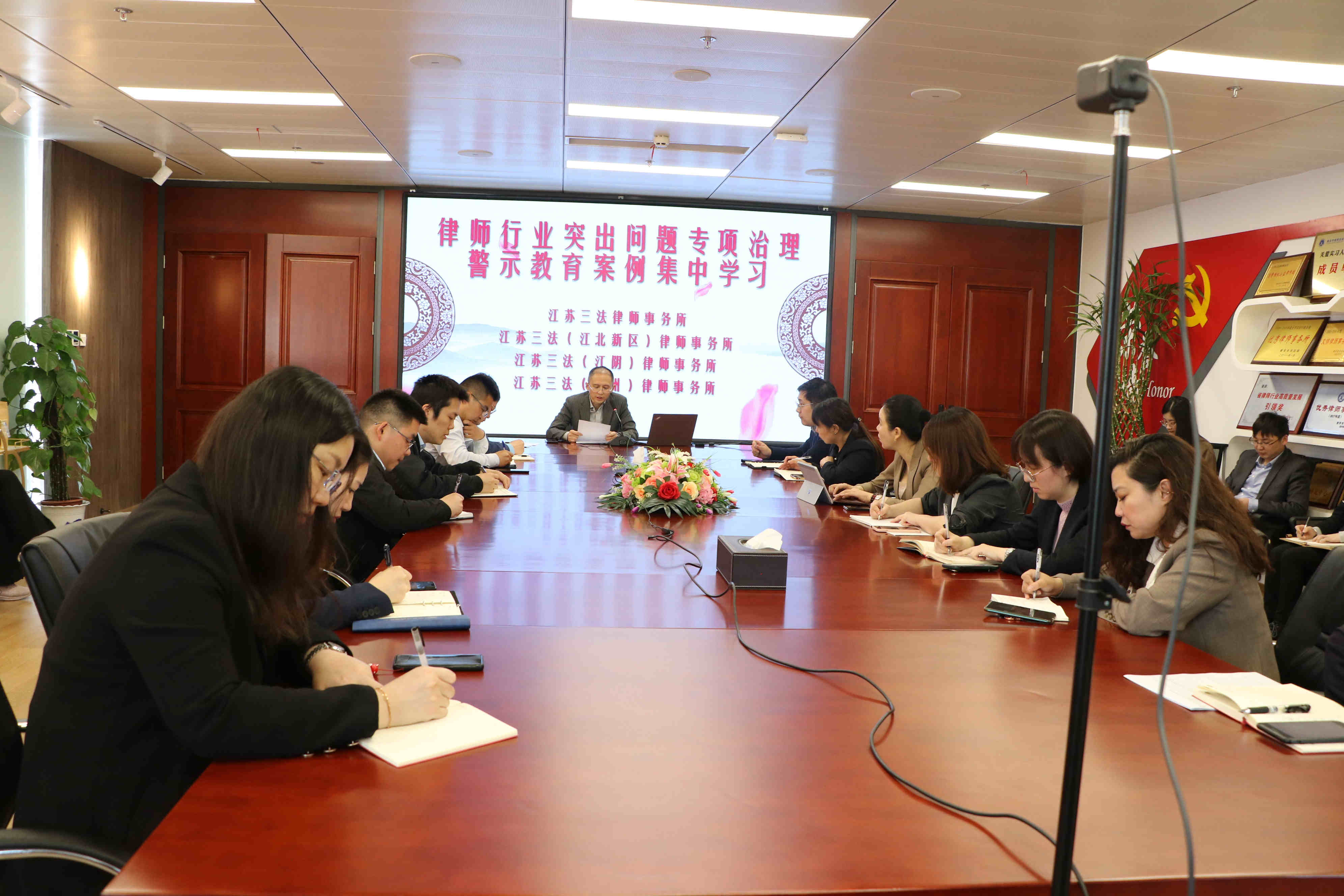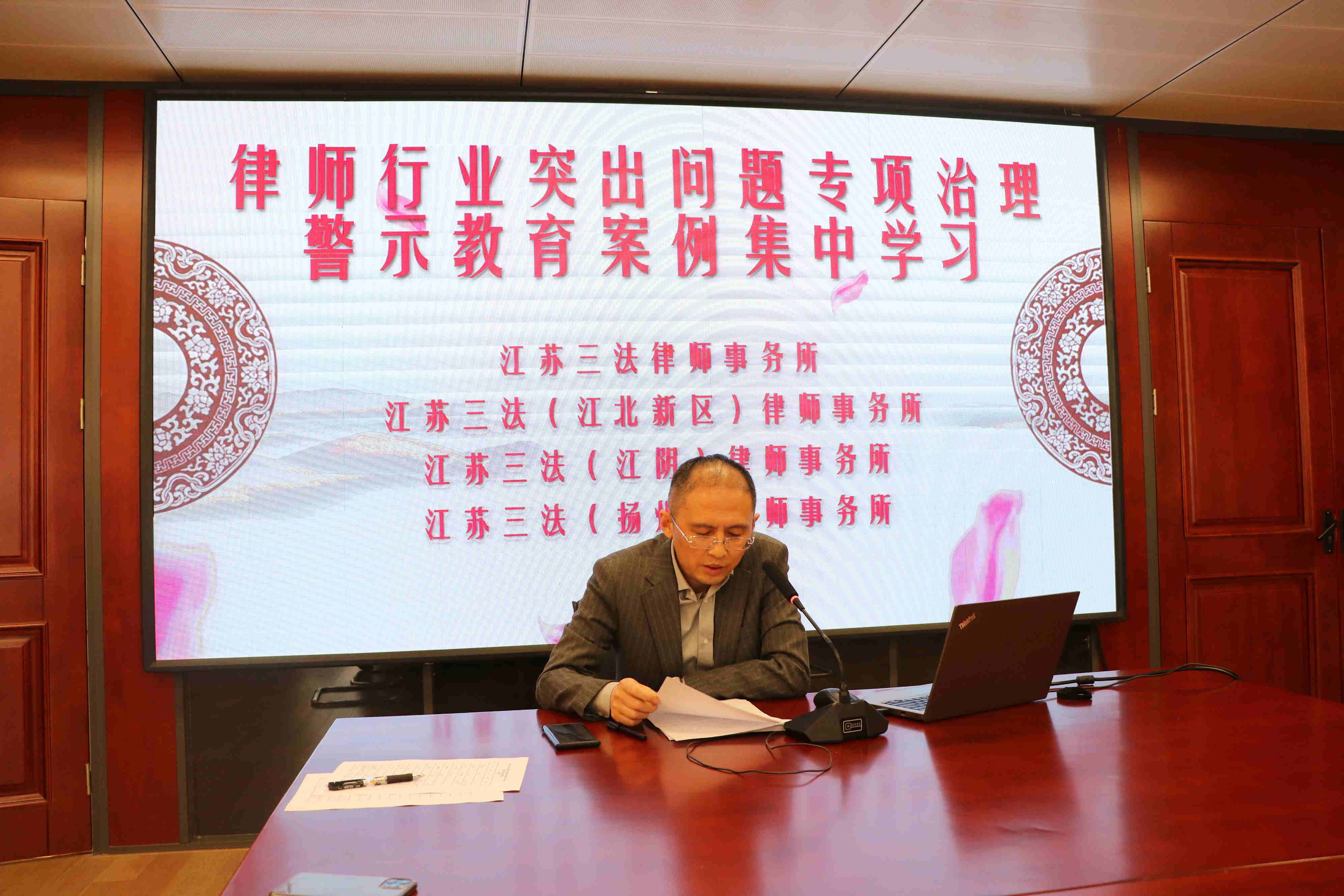 为深入学习贯彻习近平法治思想,认真贯彻落实习近平总书记关于律师工作的重要指示批示精神,根据省市关于开展党史学习教育和律师行业突出问题专项治理活动的决策部署,2021年4月9日下午,江苏三法律师事务所召开律师行业突出问题专项治理警示教育案例集中学习会。本次会议由江苏三法律师事务所创始合伙人周羽正,副主任兼江北新区分所主任张超进行授课,总所全体在所律师线下参加会议,江北分所、江阴分所、扬州分所律师线上参会。