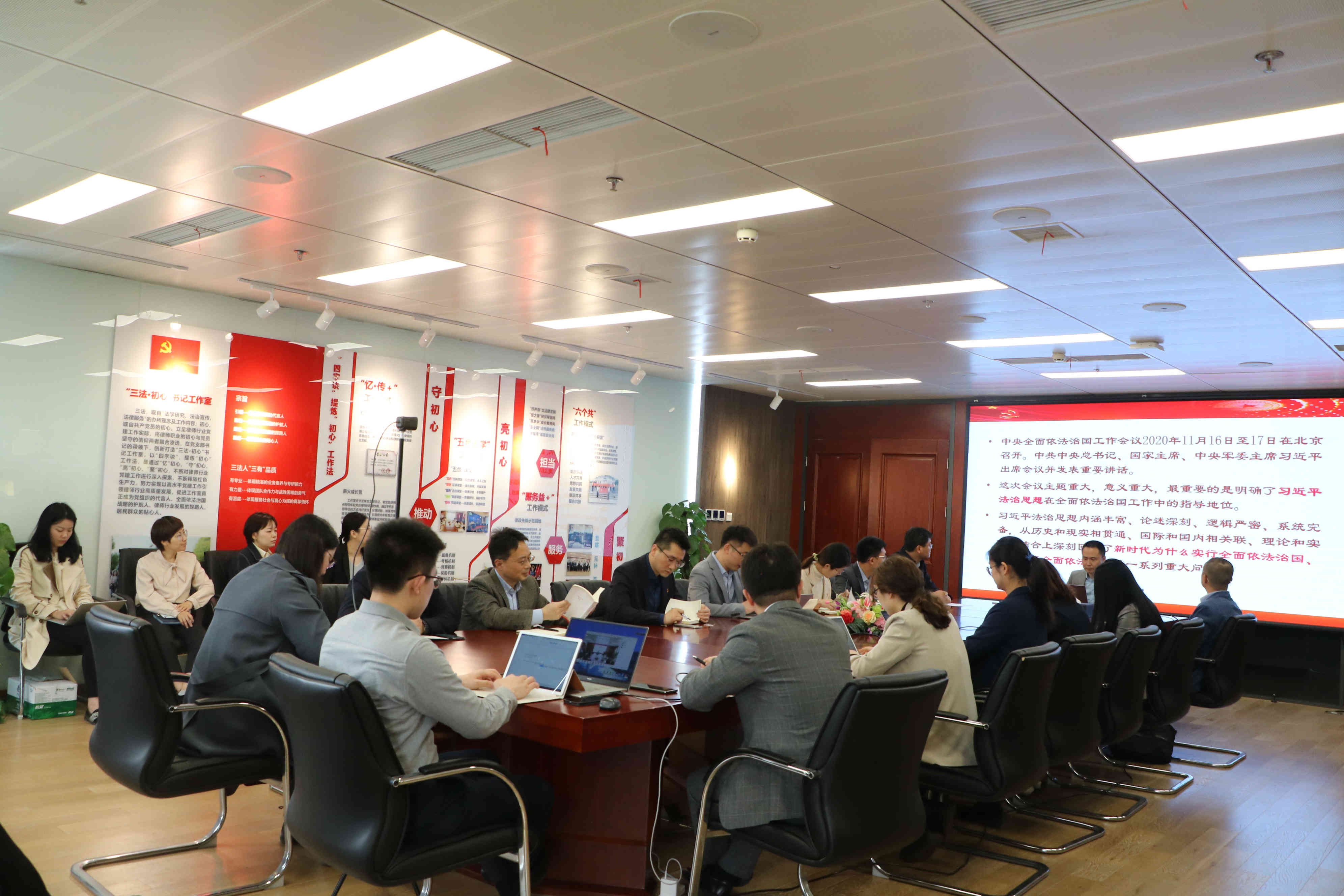 会上,刘伟书记带领与会人员分别从习近平法治思想的逻辑内涵、全面依法治国重大意义、全面依法治国现实要求、全面依法治国关键环节、全面依法治国贯彻落实五个方面展开学习,要求全所人员要深入学习领会习近平法治思想,牢牢把握习近平法治思想的重大意义、总体要求、政治方向、战略定位、重点任务等。同时,刘伟书记要求全所人员要凝聚共识,深刻认识律师行业突出问题专项治理工作的必要性,聚焦“与司法人员不正当接触交往”、“违法违规执业”两个关键点,将专项治理做实做好,推动全所律师队伍政治素质不断提升,助力律所高质量发展。