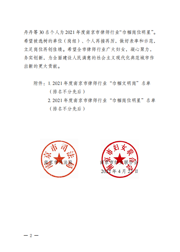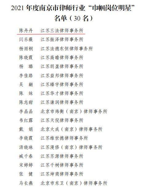 近日,南京市司法局、南京市妇女联合会联合下发《关于选树南京市律师行业“巾帼文明岗”和“巾帼岗位明星”的决定》(宁司〔2022〕32号),选树出20个单位(岗组)为2021年度南京市律师行业“巾帼文明岗”,30名个人为2021年度南京市律师行业“巾帼岗位明星”。江苏三法律师事务所一级合伙人陈丹丹律师被授予2021年度南京市律师行业“巾帼岗位明星”。
