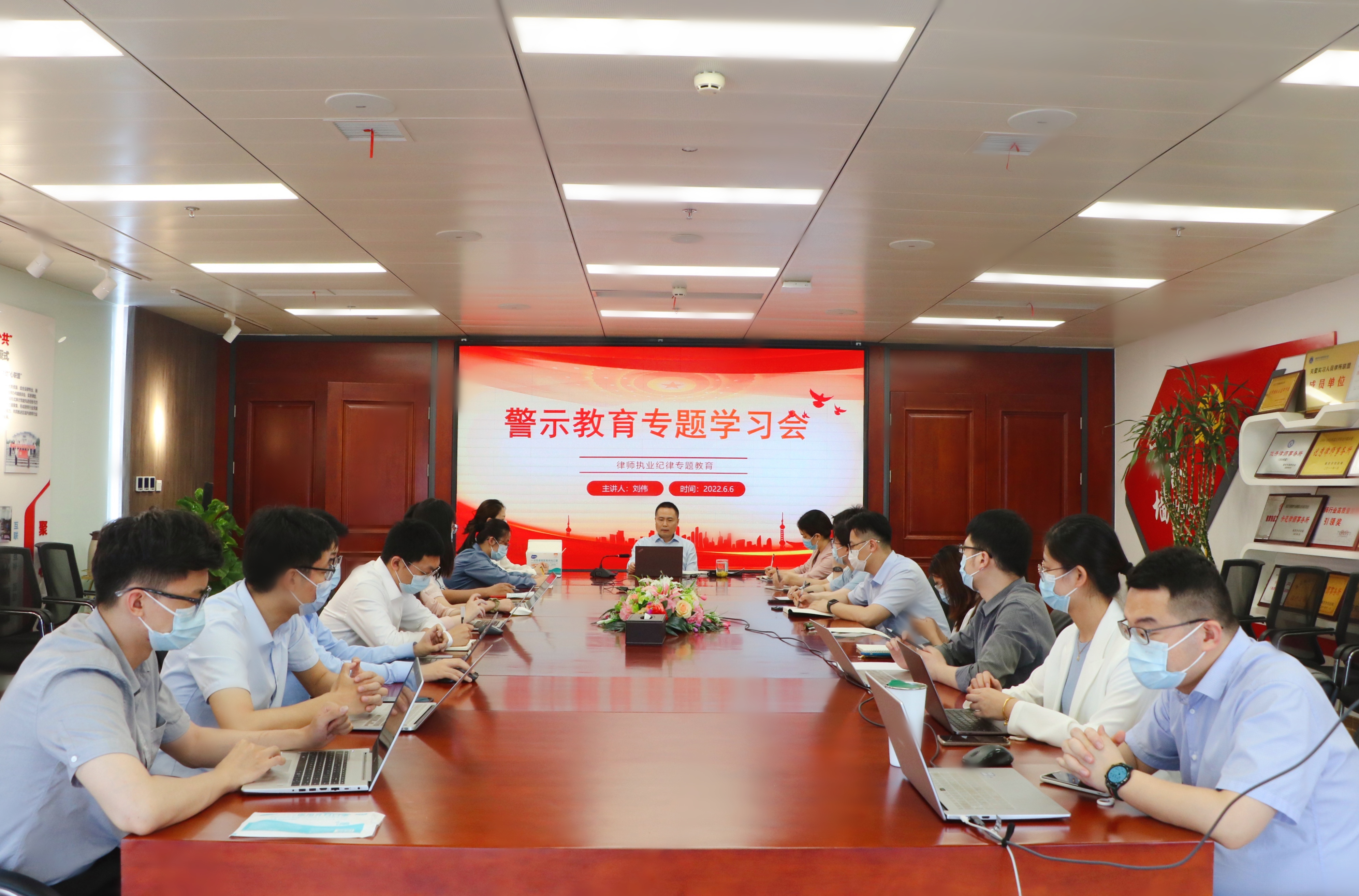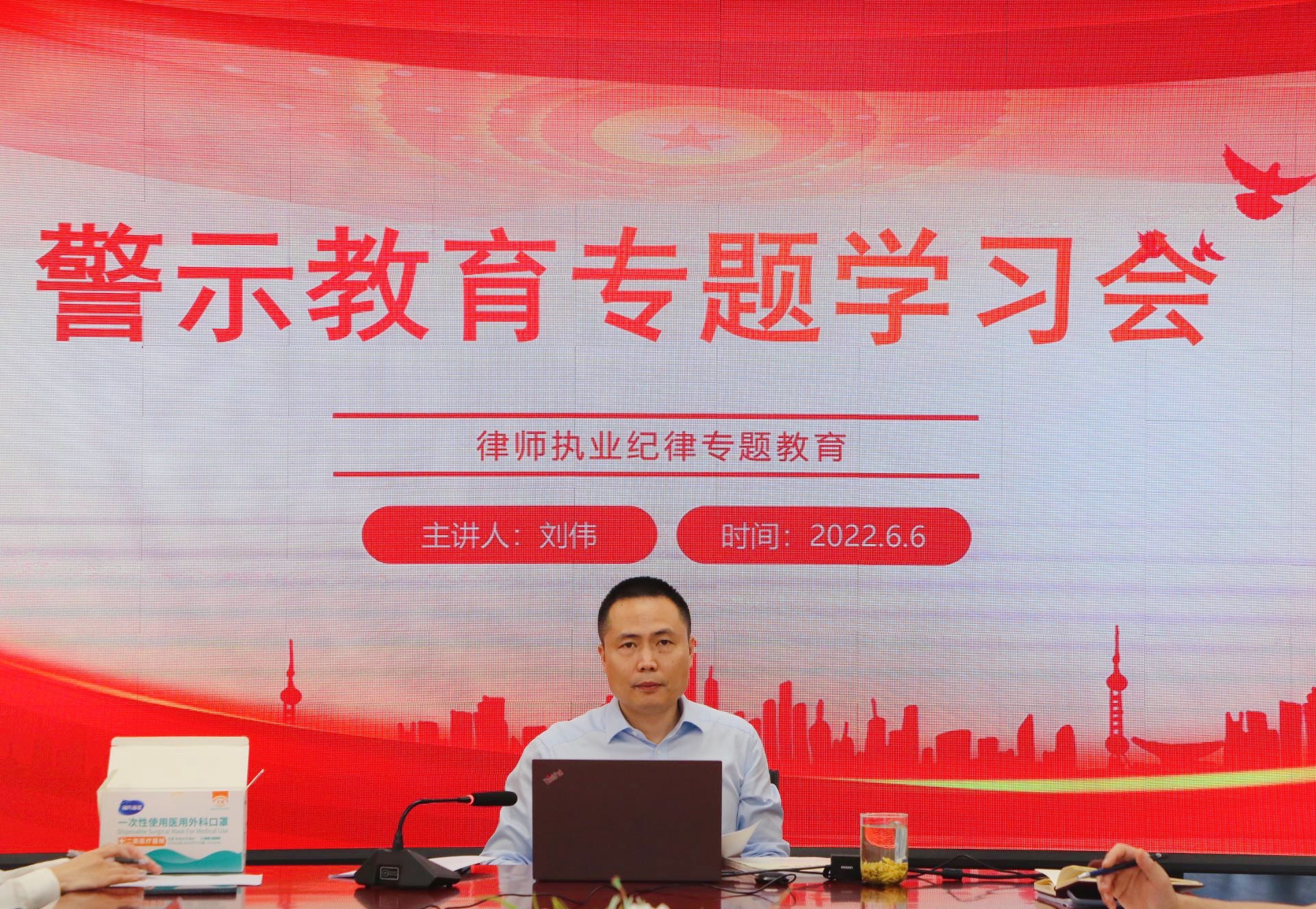 为认真贯彻落实十九届中央纪委六次全会、十四届省纪委二次全会精神,深入推进律师行业党风、行风建设,涵养廉洁文化、建设廉洁政治,根据省律师行业党委《关于开展“警示教育月”活动的通知》、市律师行业党委《关于组织开展警示教育活动的通知》部署要求,2022年6月6日,江苏三法律师事务所召开警示教育专题学习会,江苏三法律师事务所党支部书记刘伟主持会议,总所、江北新区分所全体执业律师、实习律师通过线上、线下形式参加学习。