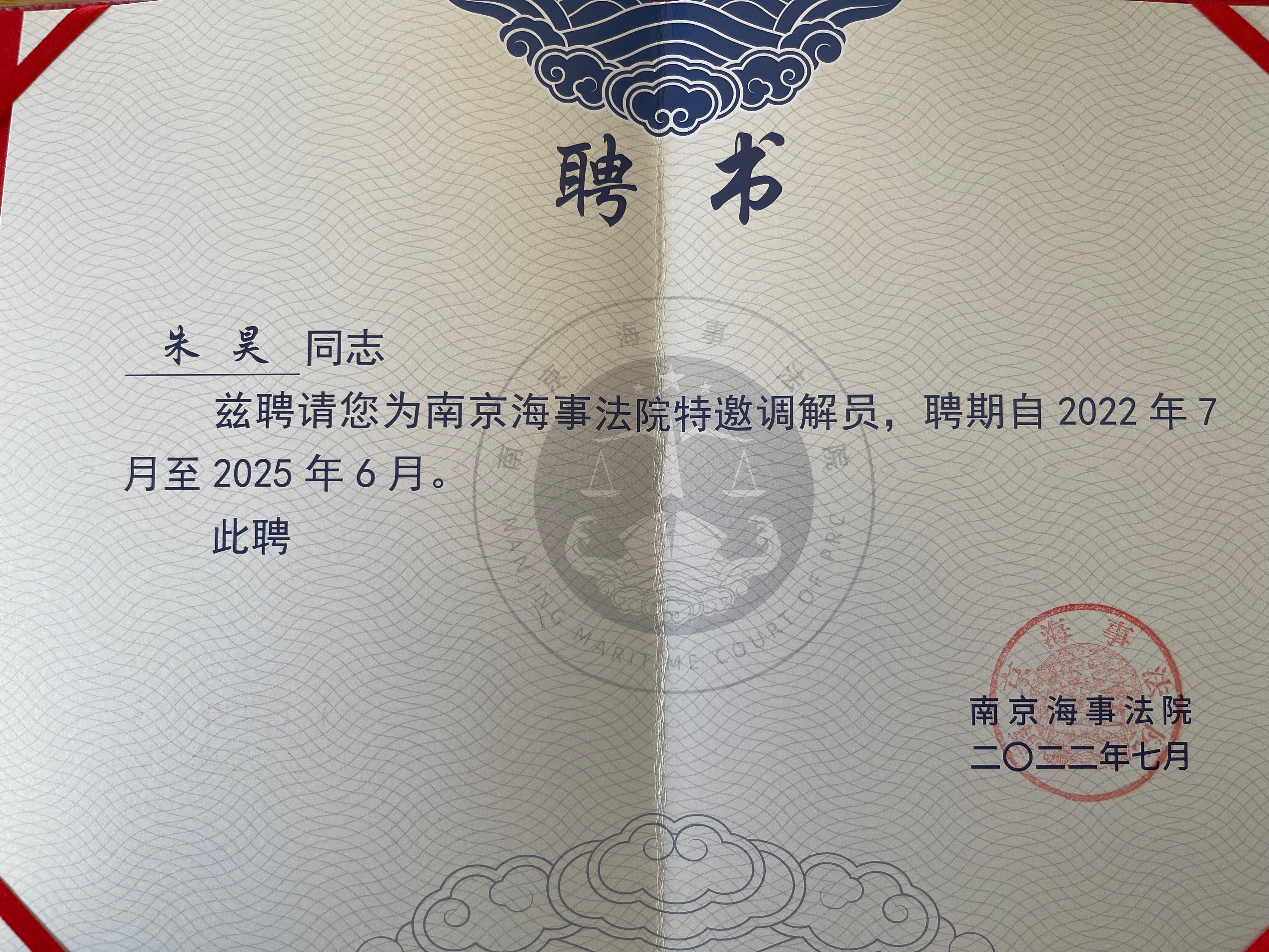 三法所高级合伙人朱昊律师获聘南京海事法院特邀调解员