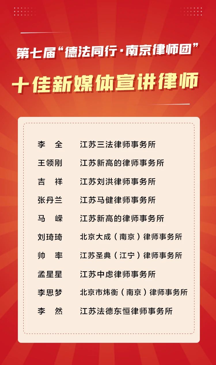 第七届《德法同行·南京律师团》出镜律师选拔大赛获奖名单于11月30日正式公布!江苏三法律师事务所李全律师当选十佳新媒体宣讲律师。