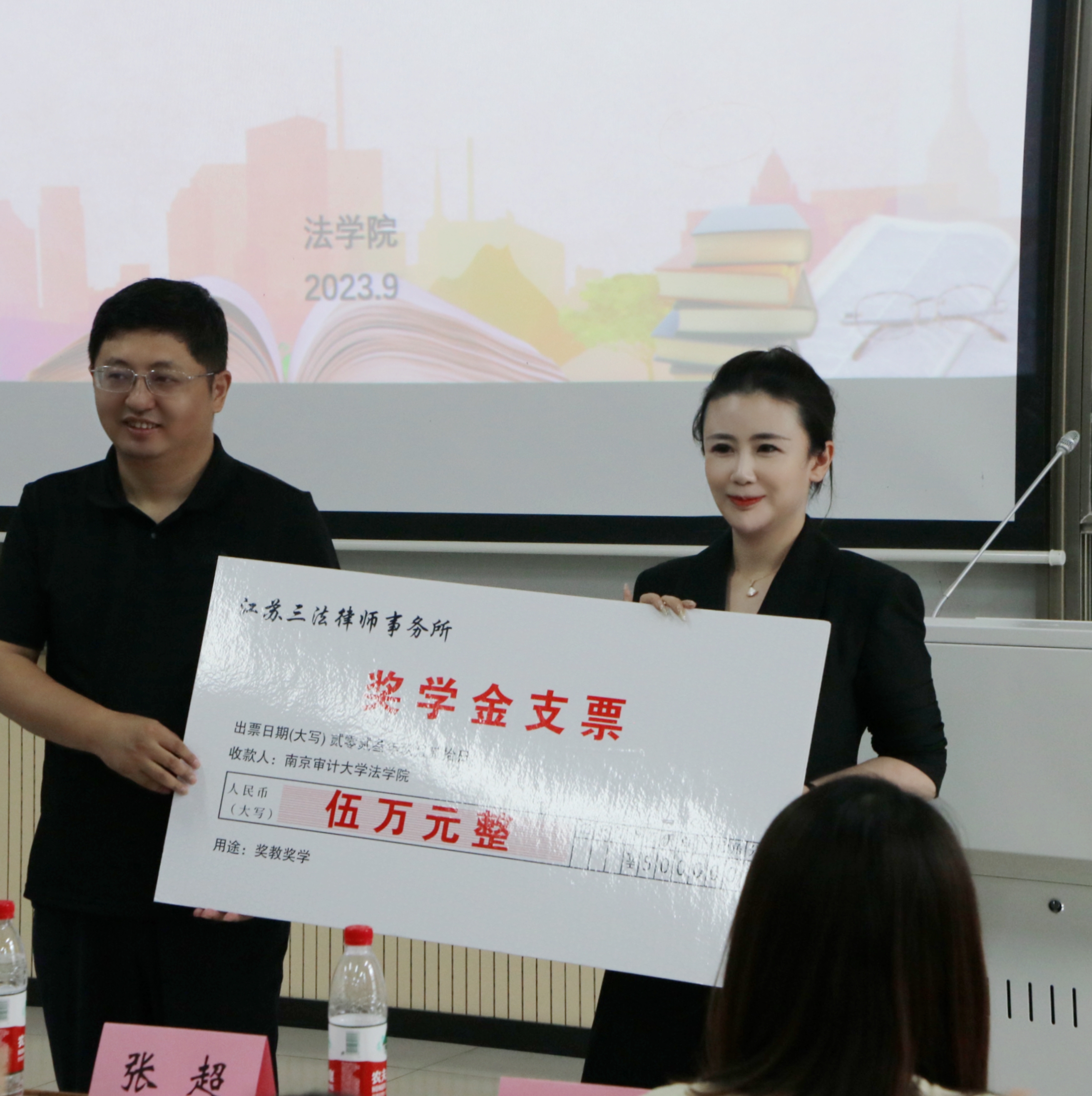 法学院党委书记刘宏宇和三法所执行主任章宁分别代表南京审计大学法学院和江苏三法律师事务所进行了奖学金捐赠仪式。