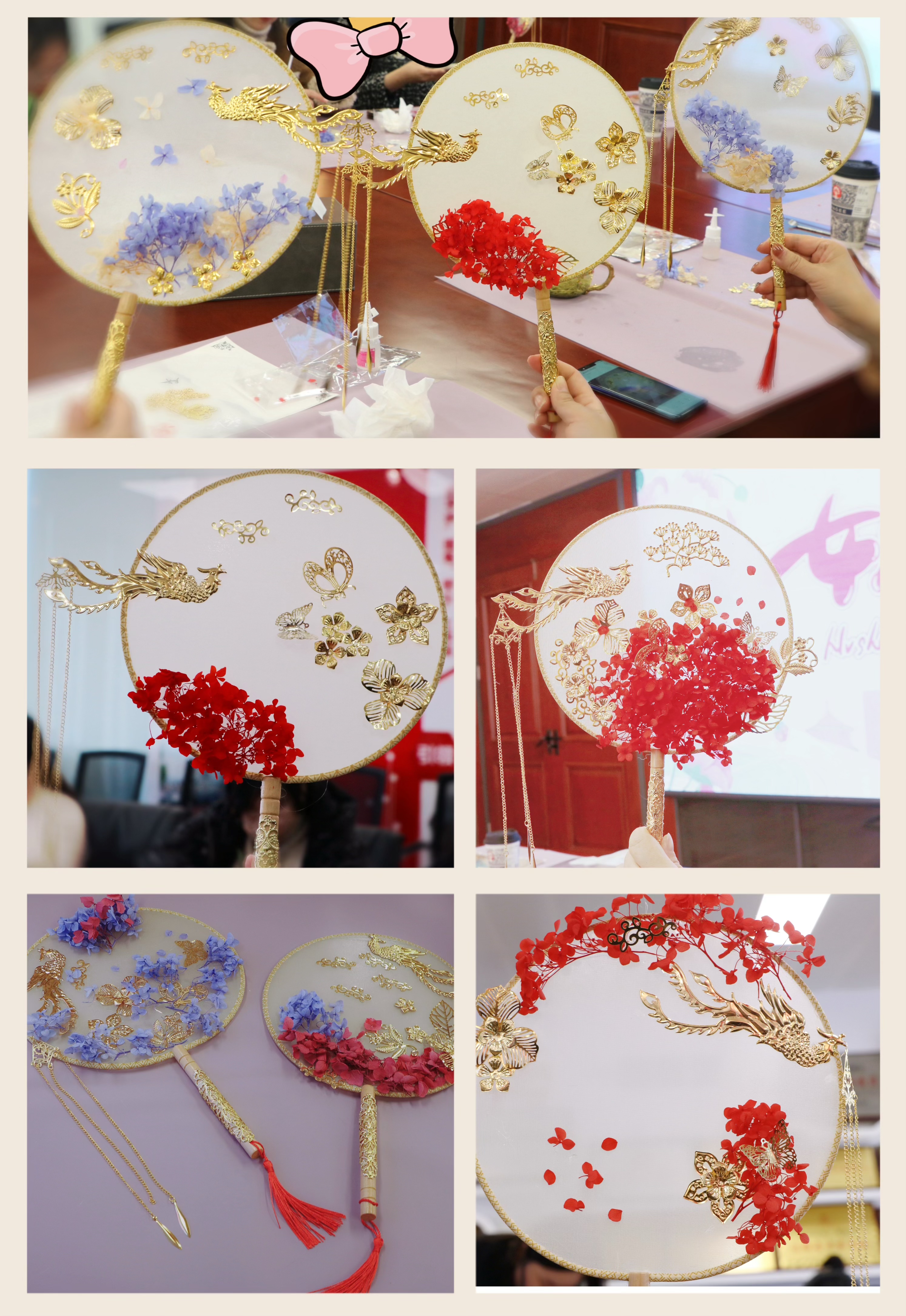 在令人期待的制作环节,三法女神们充分发挥自己的创意与构思,一朵朵干花、各种样式的金属构件在团扇上展现出了它们独特的风采,让素白的扇面变得缤纷多彩、栩栩如生。
