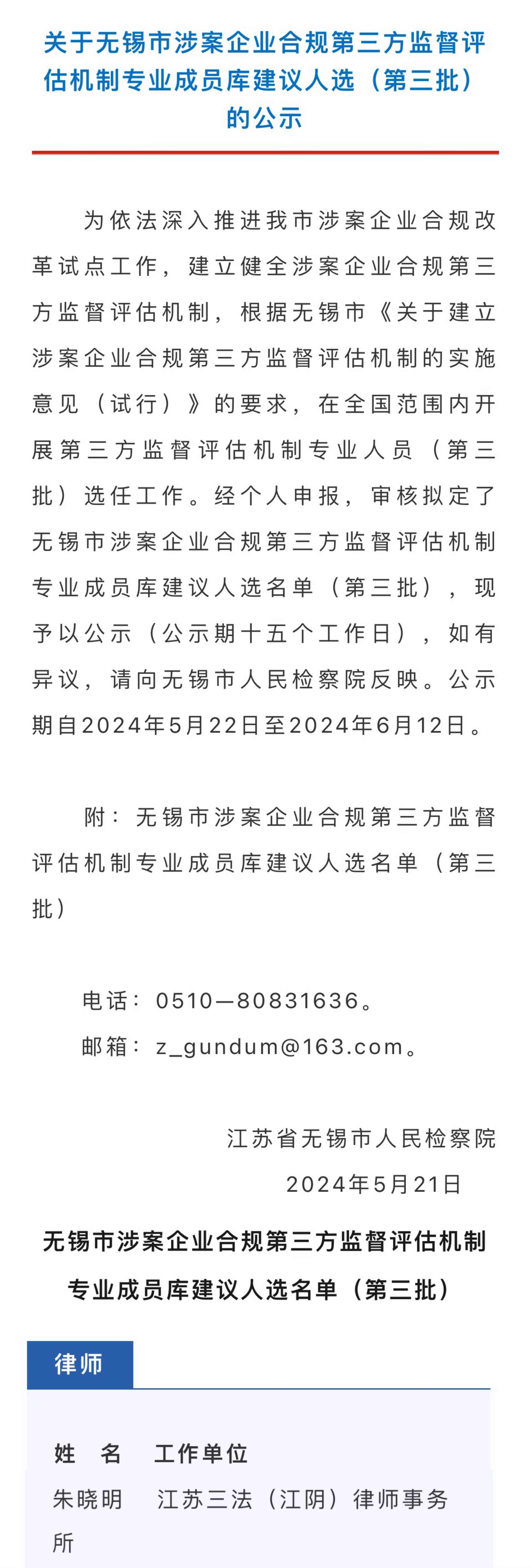 江苏三法(江阴)律师事务所朱晓明主任成功入选无锡市涉案企业合规第三方监督评估机制专业成员库,并已通过公示期。