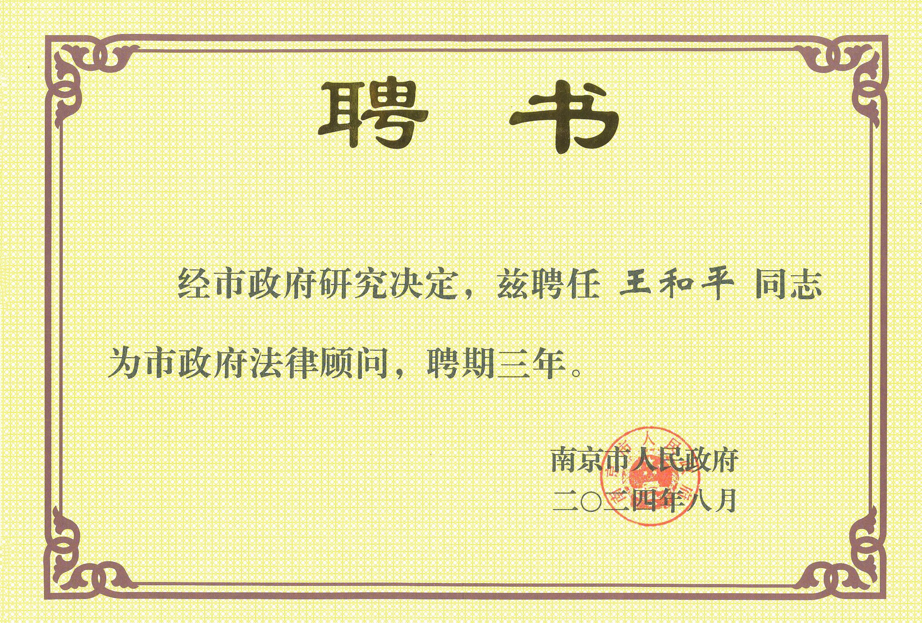 三法所王和平律师续聘担任南京市政府法律顾问