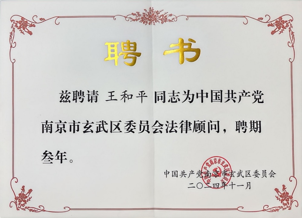 江苏三法律师事务所管理合伙人王和平被聘为第二届南京市玄武区委员会法律顾问,聘期三年。