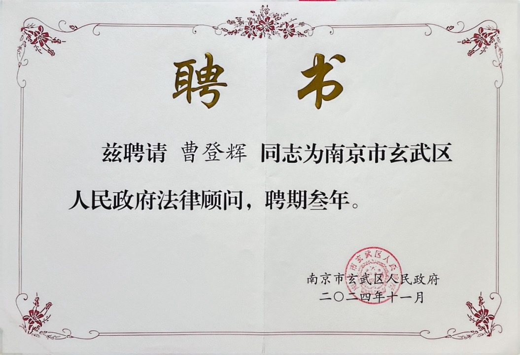 江苏三法律师事务所高级合伙人曹登辉被聘为第二届南京市玄武区人民政府法律顾问,聘期三年。