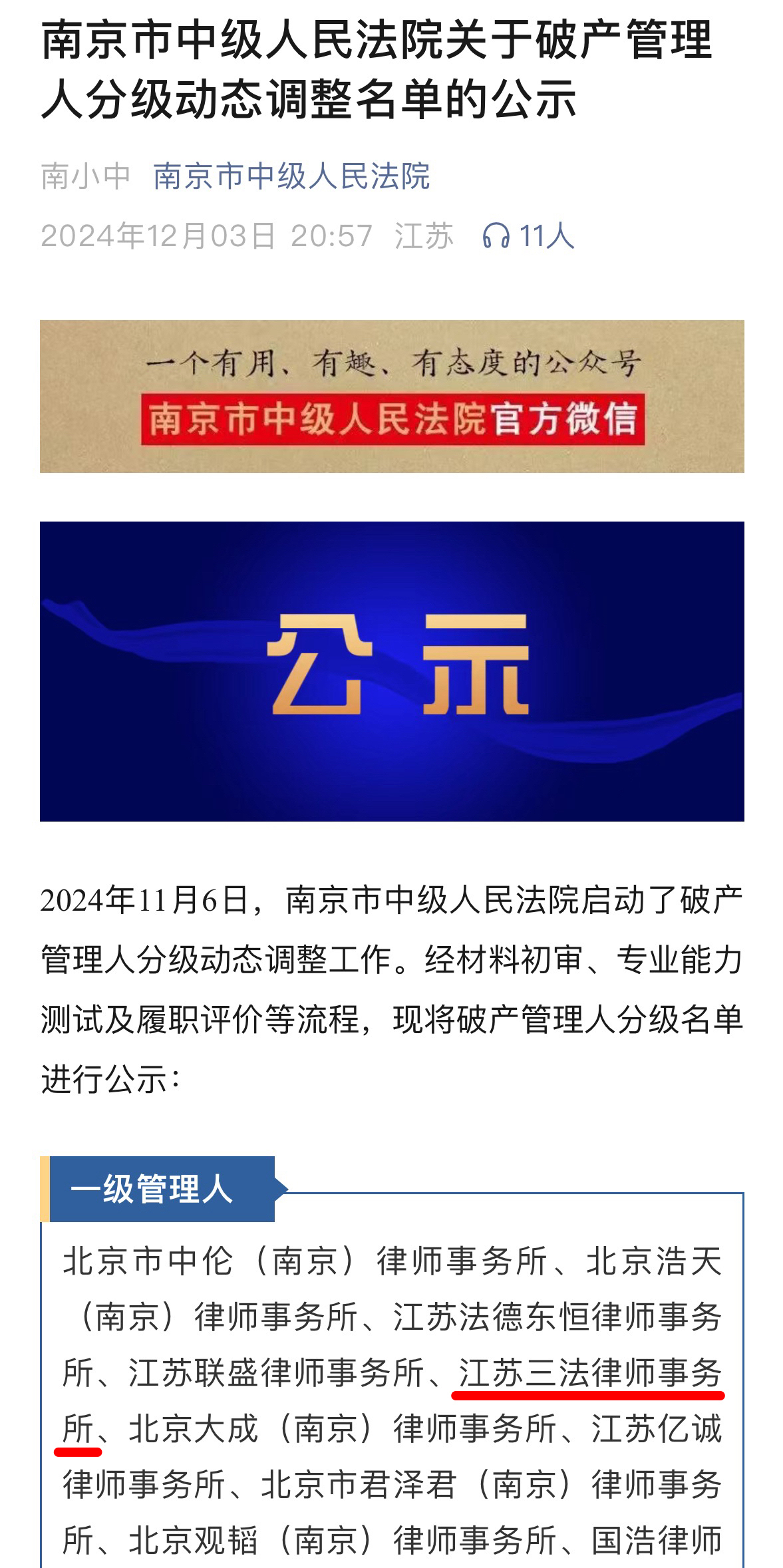 为强化对破产管理人的监督管理,保障破产审判工作高效推进,结合我市破产审判实际,南京市中级人民法院启动破产管理人分级动态调整工作。近日,经材料初审、专业能力测试及履职评价等流程,南京市中级人民法院对破产管理人分级名单进行公示,江苏三法律师事务所成功入册南京市中级人民法院一级破产管理人,并已通过公示期。