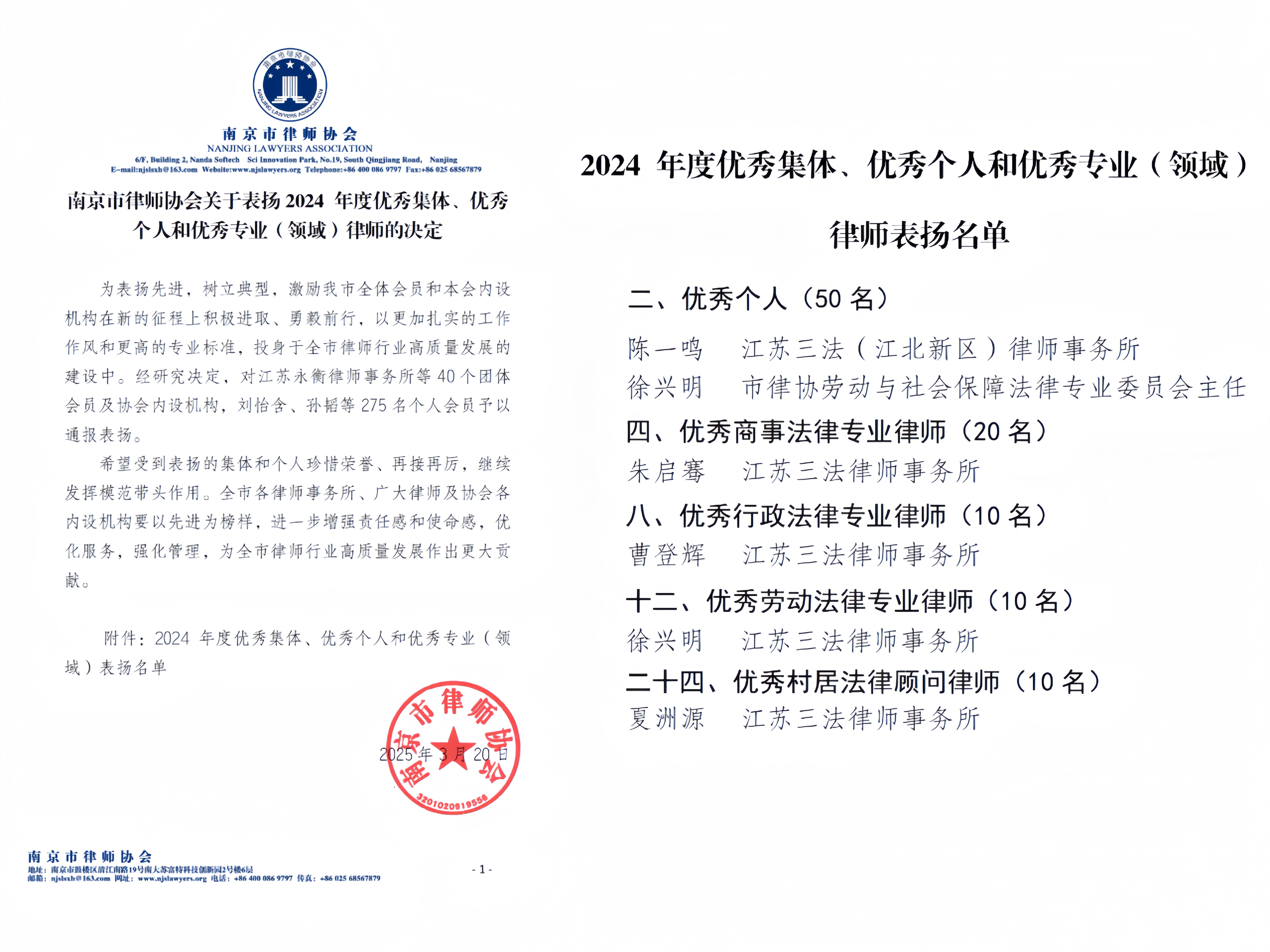 Èý·¨Ëù¶àÃûÂÉʦ»ñÄϾ©ÊÐÂÉʦлá2024Äê¶È±íÕÃ
