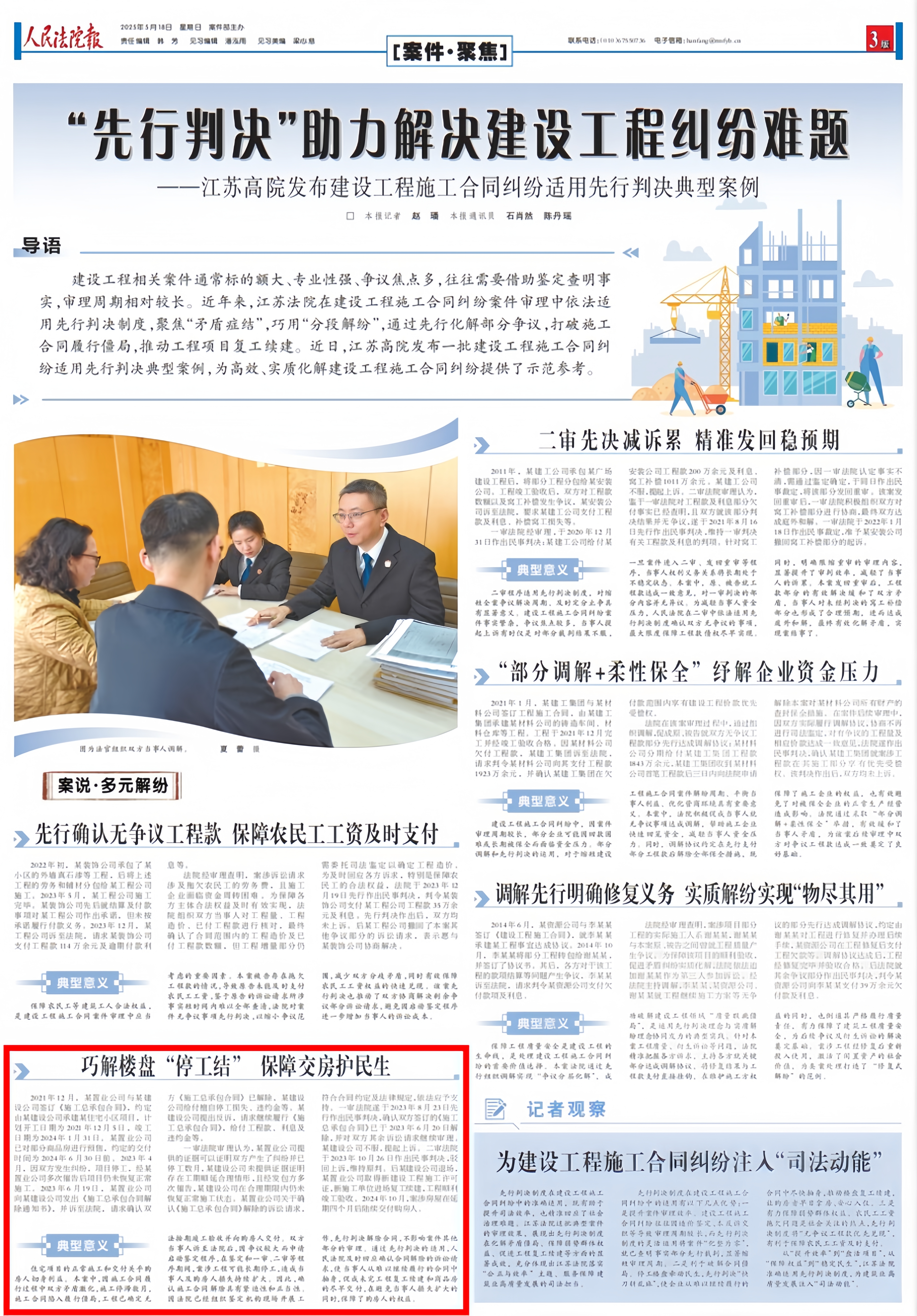 5月18日,《人民法院报》整版报道了江苏高院发布的建设工程施工合同纠纷适用先行判决典型案例,其中,江苏三法律师事务所孙鹏、孙慈、杨天贤律师承办的巧解楼盘“停工结”,保障交房护民生——某置业公司诉某建设公司建设工程施工合同纠纷案入选并被刊载。