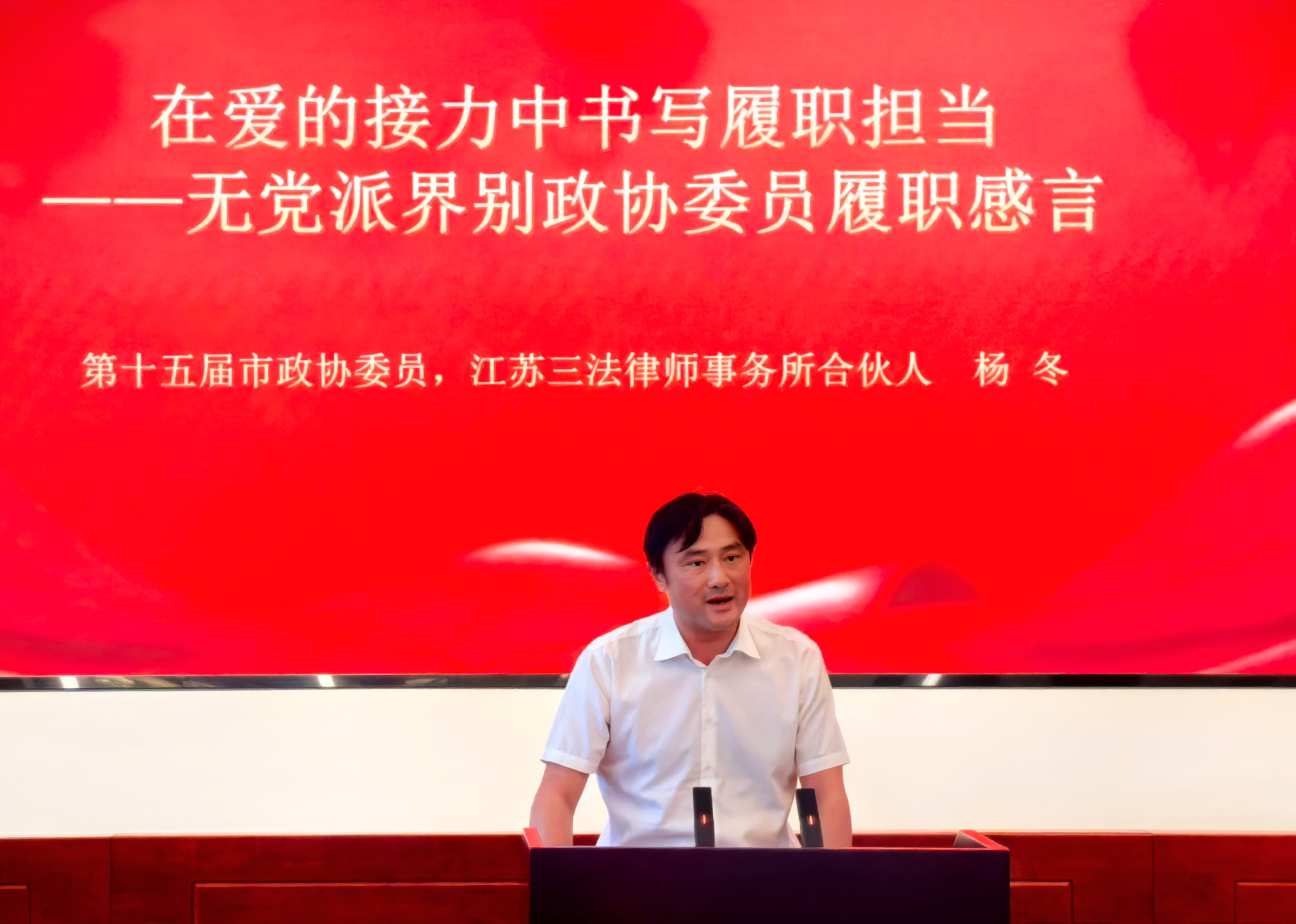 7月10日,庆祝南京市政协成立70周年“我的履职故事・我在政协工作”演讲会举行。市政协主席王立平出席并讲话。市政协副主席陈勇、蒋跃建、李奇、杨平、黄利民、程永波、金卫东、黄辉、傅阳参加,秘书长刘莅主持。市政协局级以上领导干部、部分市政协委员和机关干部参加。江苏三法律师事务所管理合伙人杨冬律师受邀参会,并作为7名历届市政协委员代表之一作主题演讲。