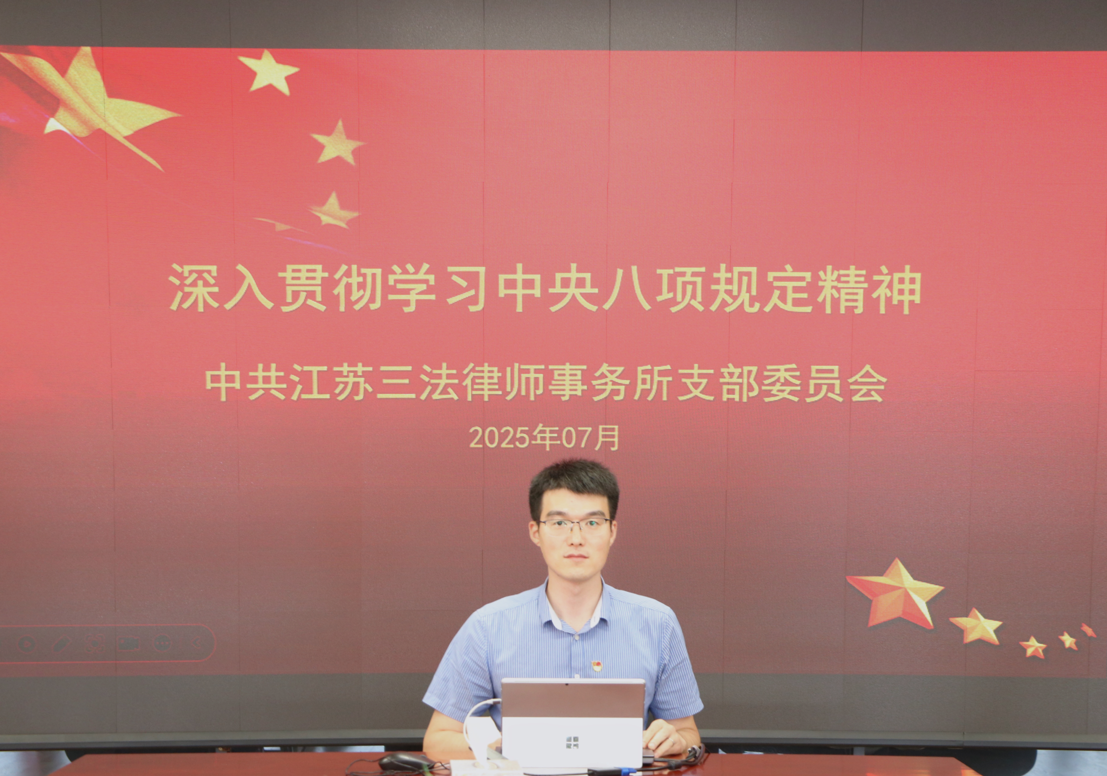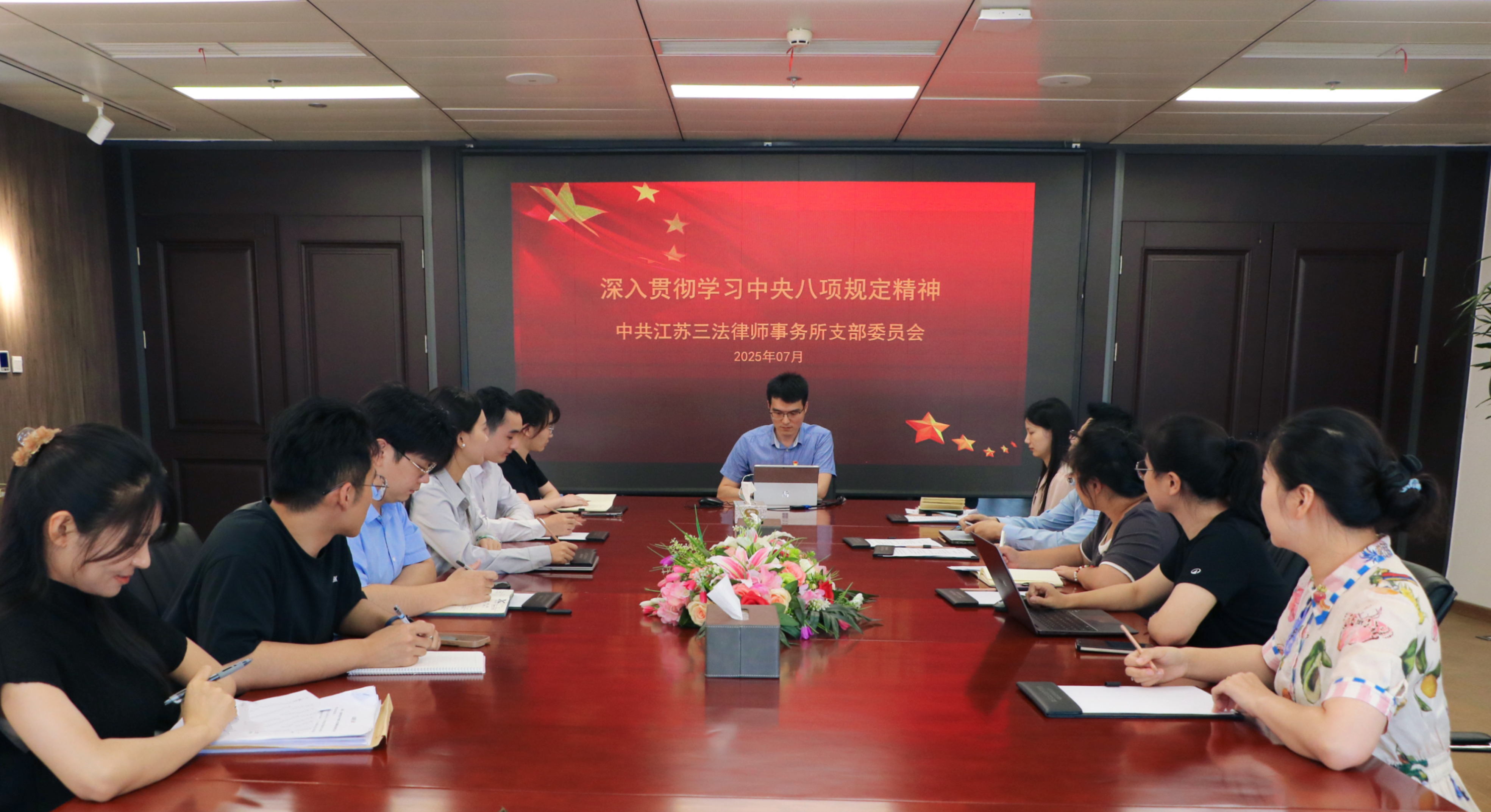 为深入贯彻中央八项规定精神学习教育,进一步强化作风建设,7月25日,江苏三法律师事务所党支部组织全所党员律师、青年律师开展深入贯彻中央八项规定精神学习教育专题学习会。