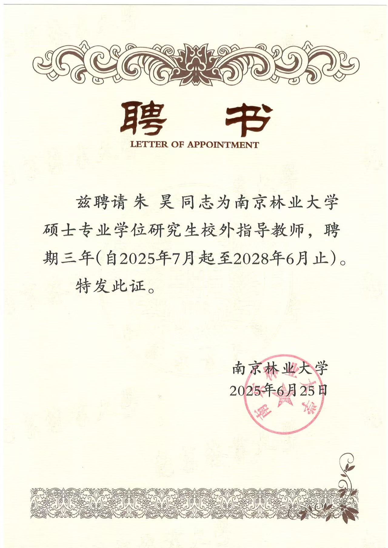 近日,江苏三法律师事务所高级合伙人朱昊律师受聘为南京林业大学硕士专业学位研究生校外指导教师,聘期三年。