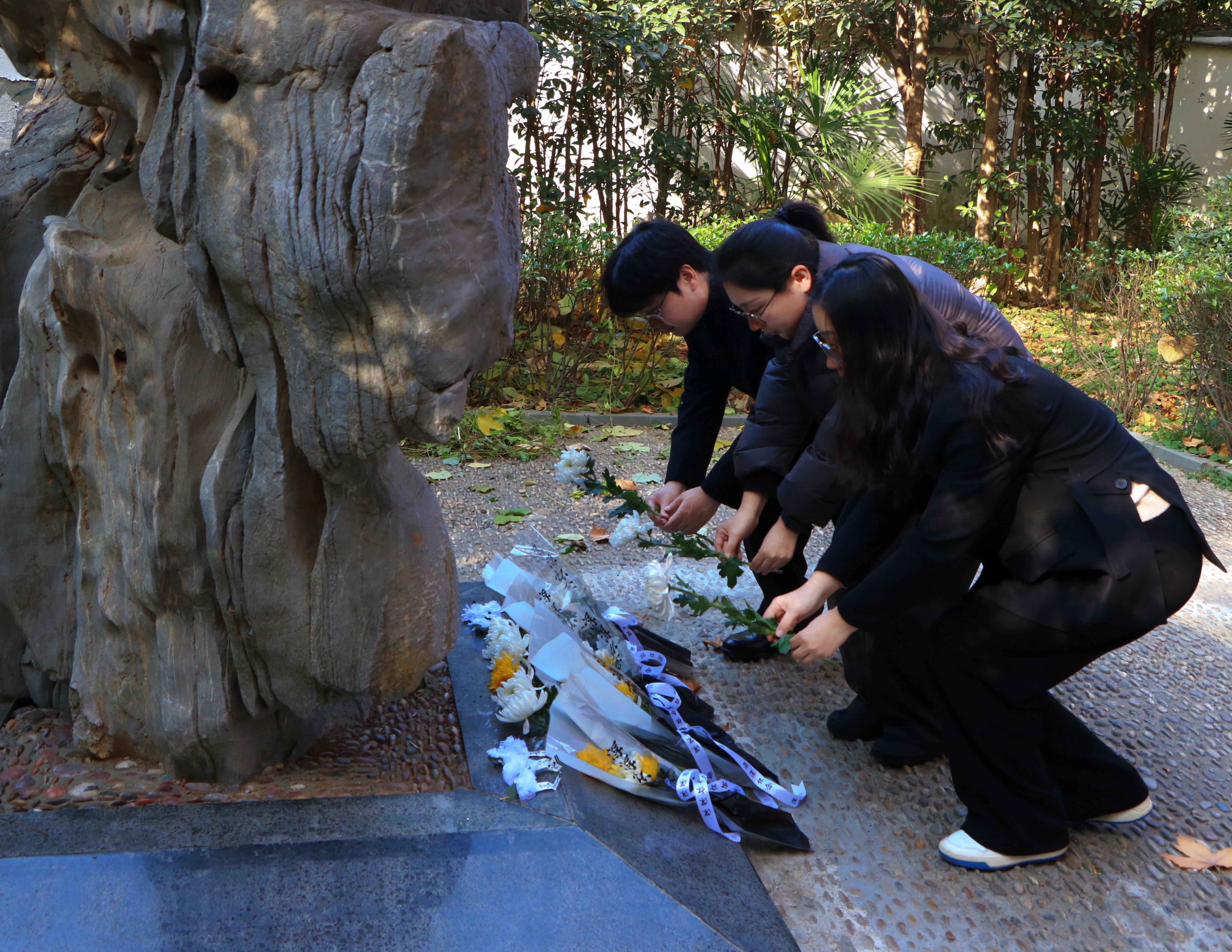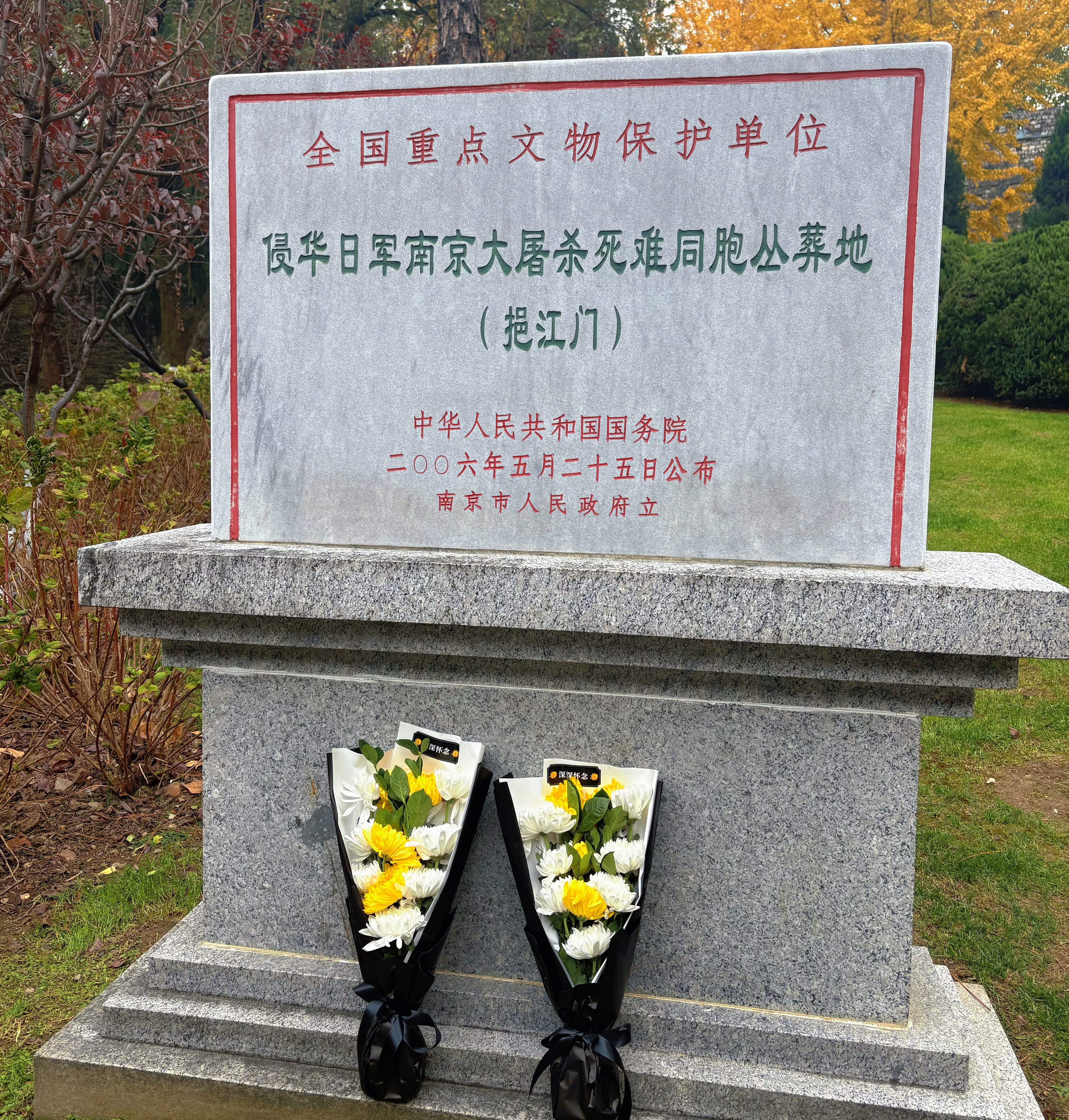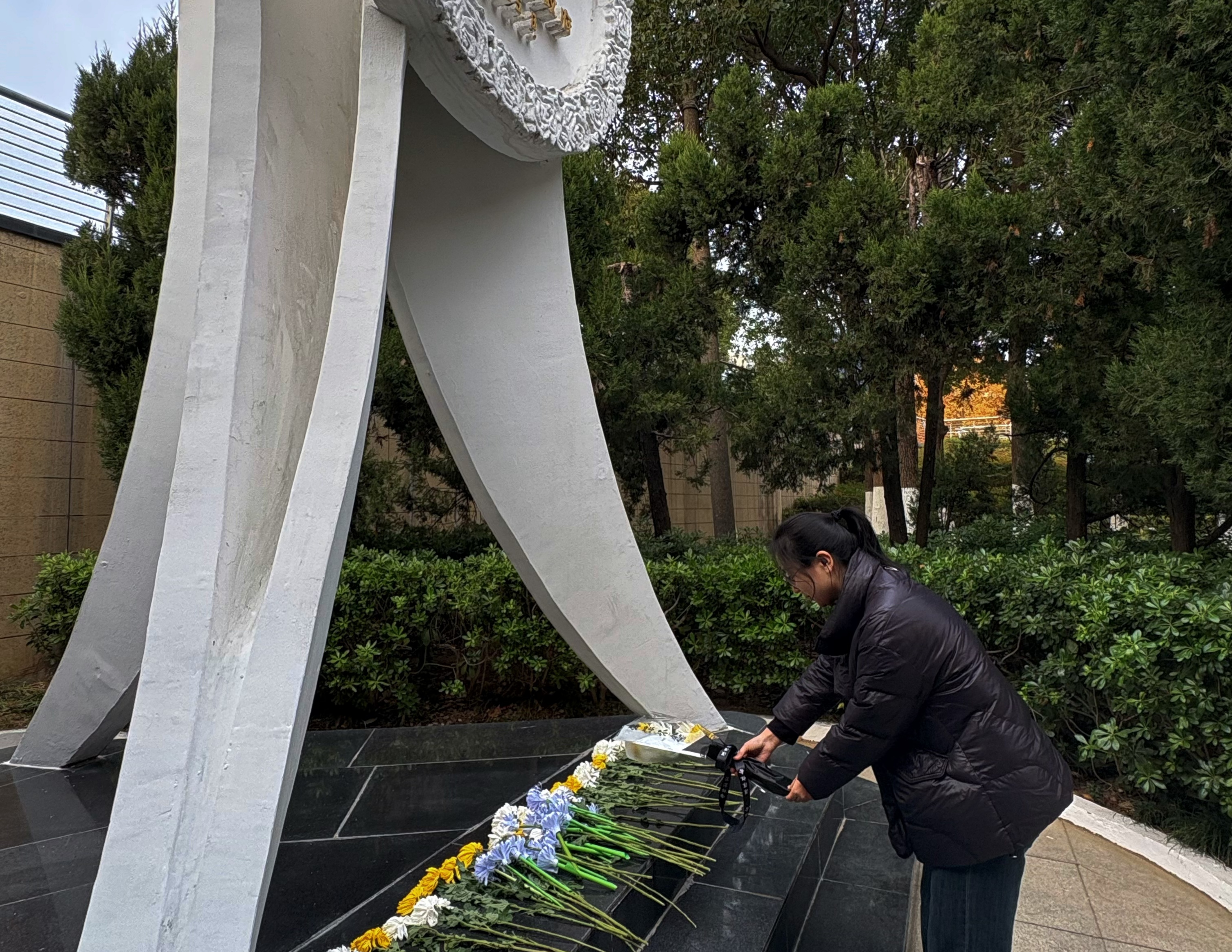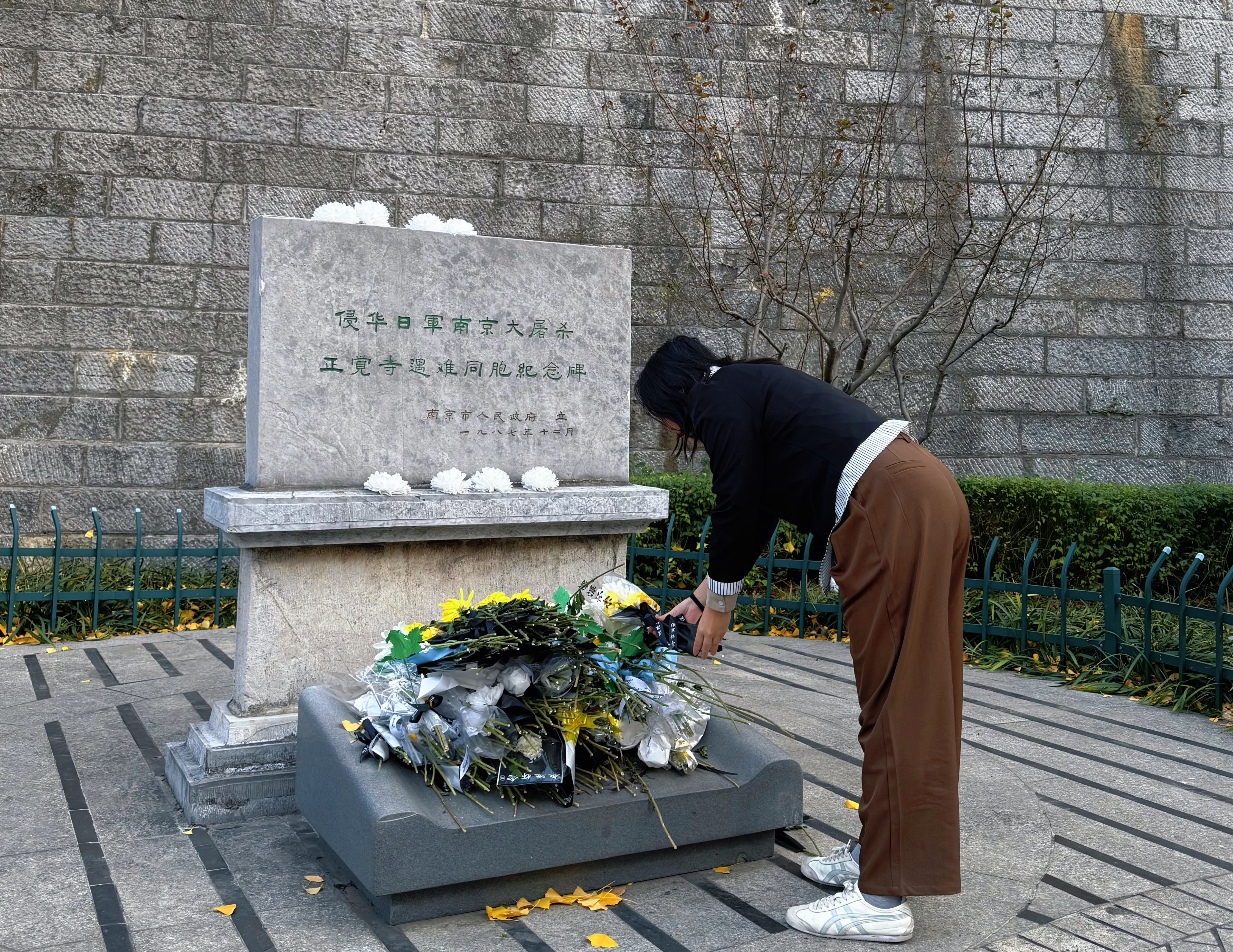 默哀完毕,大家依次走到纪念碑前,敬献鲜花,以此缅怀那段山河破碎、生灵涂炭的苦难历史,悼念在浩劫中不幸罹难的无辜同胞。