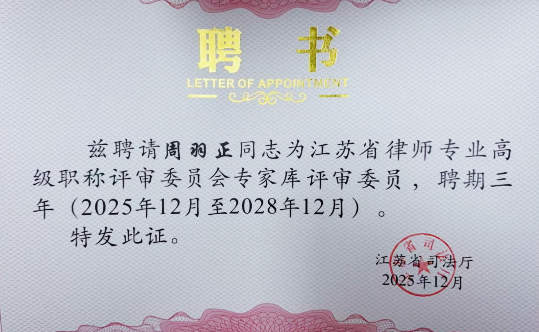 近日,江苏三法律师事务所创始合伙人周羽正律师再次被聘为江苏省律师专业高级职称评审委员会专家库评审委员。