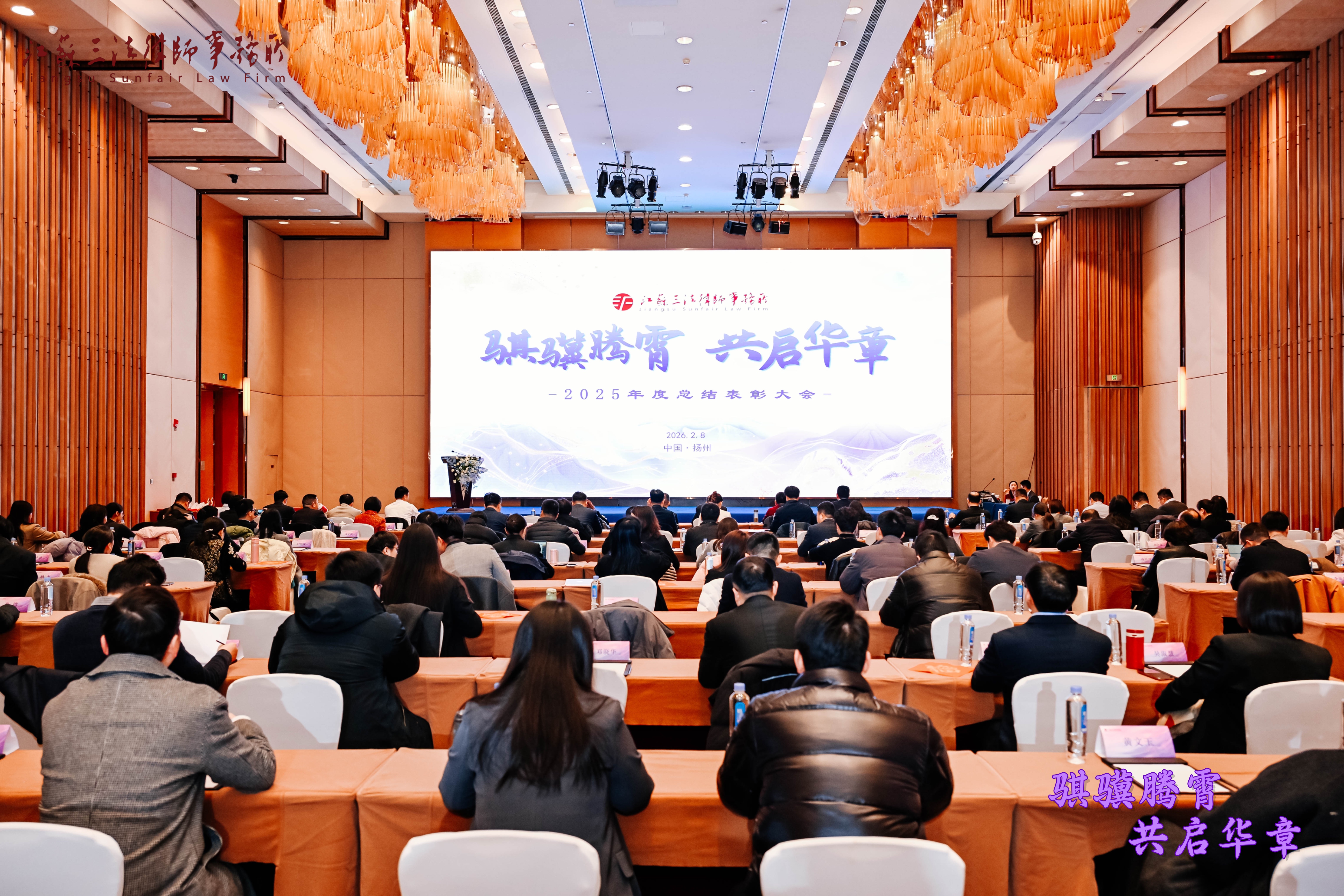 灵蛇辞旧承佳绩,骏马奔腾迎新春。2026年2月8日,江苏三法律师事务所2025年度总结表彰大会在扬州皇冠假日酒店隆重举行。总、分所全体同仁欢聚一堂,满载过去一年的奋斗硕果,以奋进之姿、昂扬之志共绘三法2026年高质量发展新篇章。