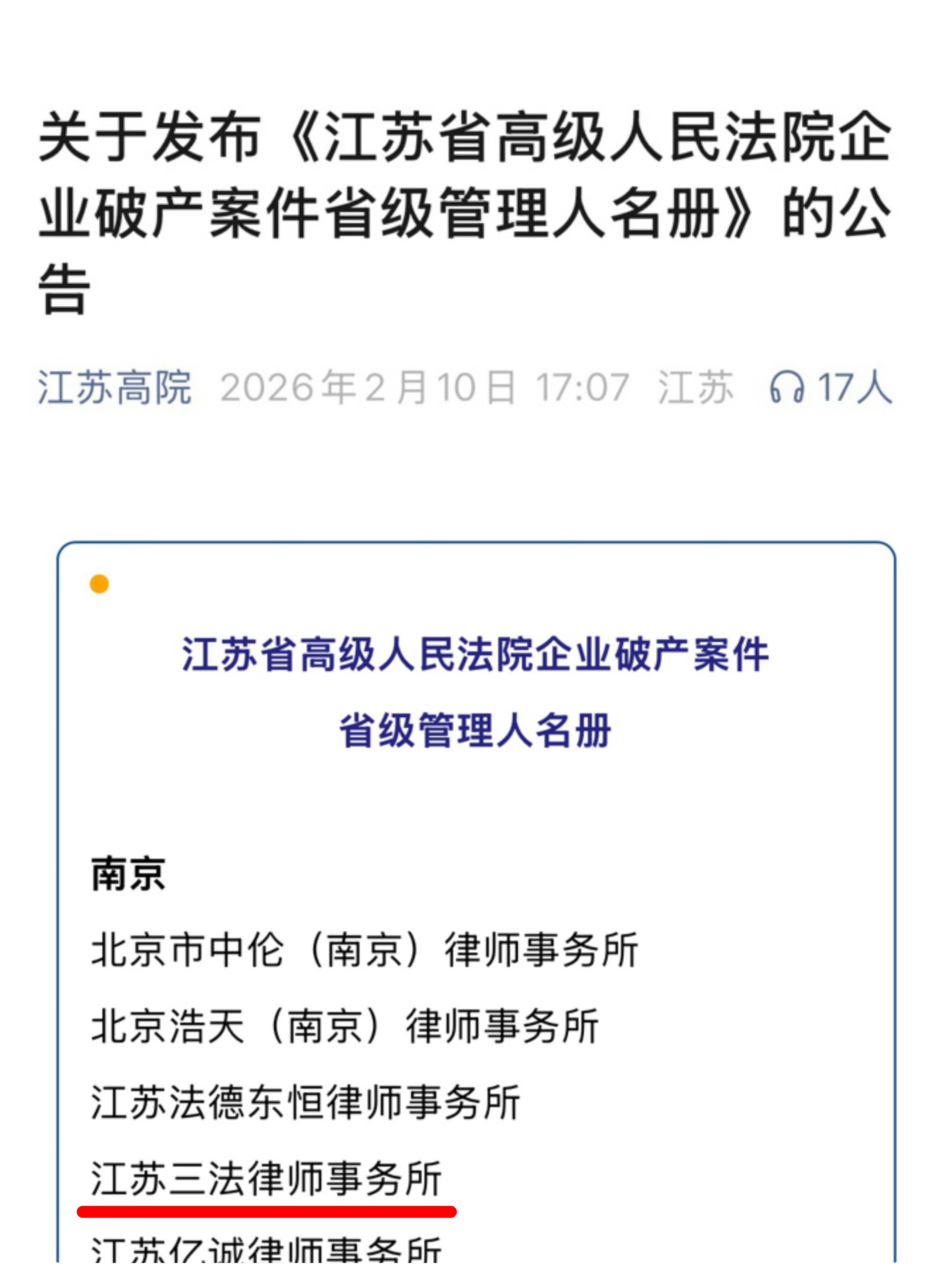 近日,江苏省高级人民法院发布了《江苏省高级人民法院企业破产案件省级管理人名册》,江苏三法律师事务所凭借在企业破产业务领域深厚的专业积淀与卓越的实务能力成功入选!