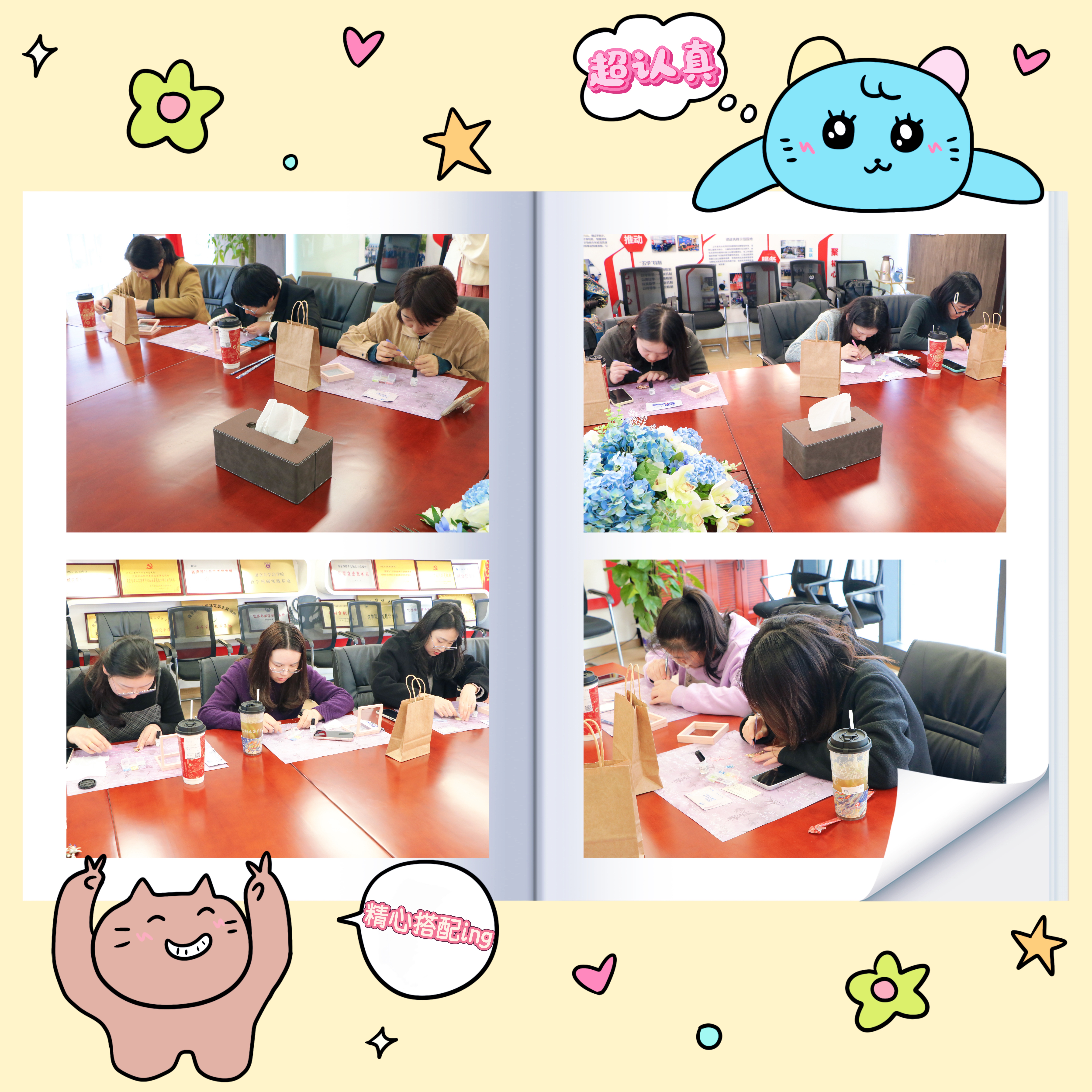 在老师的细致指导下,三法女神们迅速沉浸到手作世界中,化身为专注的“非遗手艺人”。从精心挑选螺钿片、构思图案布局,到细心打磨、轻柔嵌贴,每一个步骤都凝聚着大家的专注与巧思。从最初的生疏,到逐渐熟练操作,零散的螺钿片在指尖被重新赋予生命。