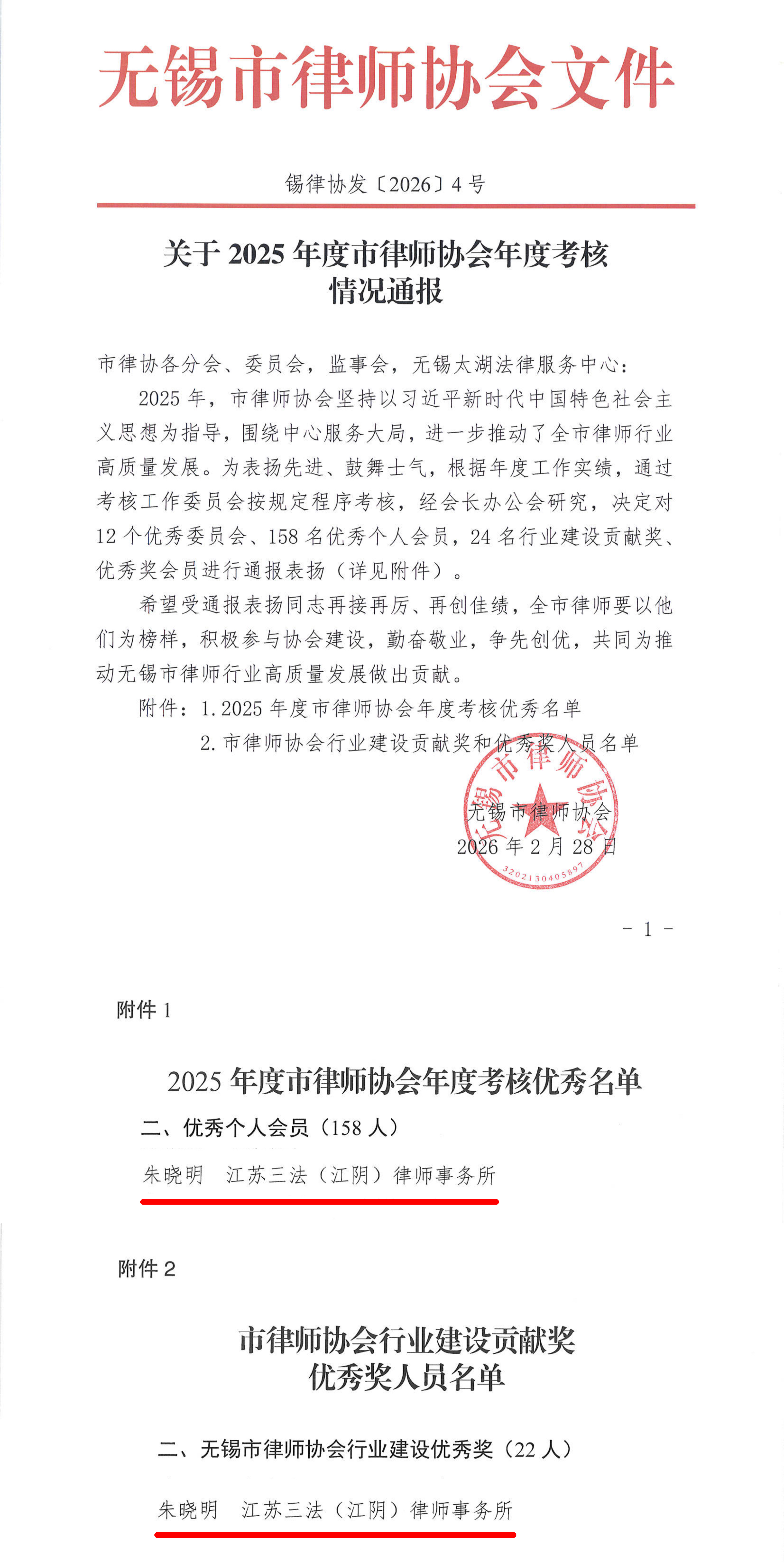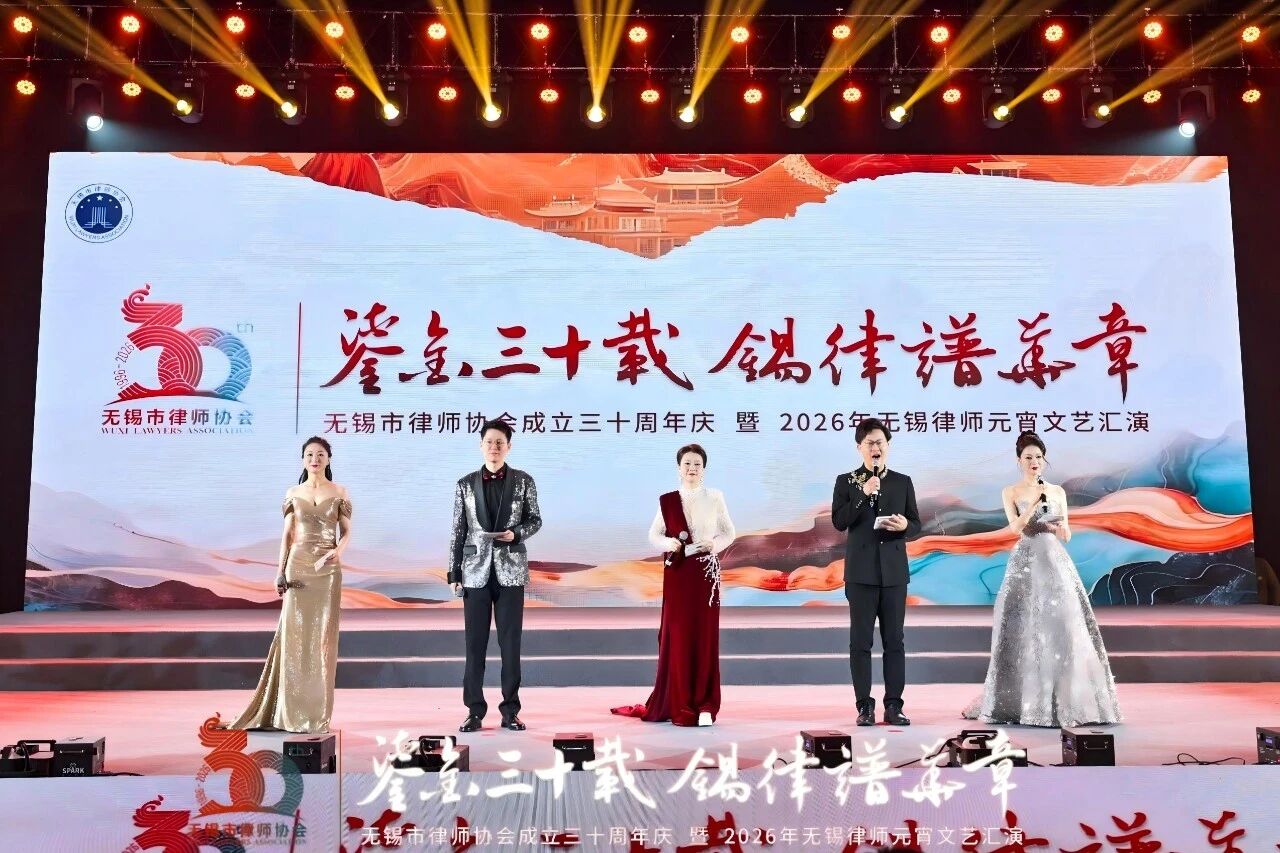 3月2日,无锡市律师协会成立三十周年庆暨2026年无锡律师元宵文艺汇演隆重举行。活动现场向一批行业优秀律师代表授予荣誉,其中,江苏三法(江阴)律师事务所主任朱晓明律师喜获“2025年度无锡市律师协会行业优秀个人会员”“无锡市律师协会行业建设优秀奖”两项荣誉称号!